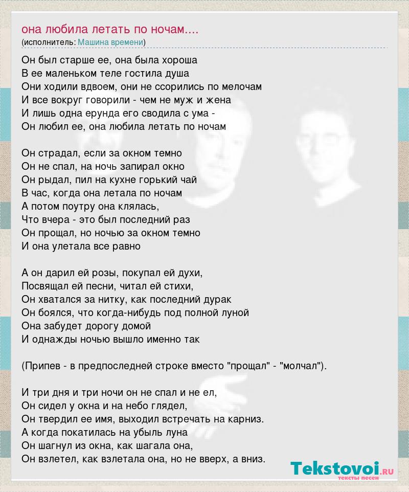 Он был старше ее, она была хороша В ее маленьком теле гостила душа Они ходили вдвоем, они не ссорились по мелочам И все вокруг говорили - чем не муж и жена И лишь одна ерунда его сводила с ума - Он любил ее, она любила летать по ночам Он страдал, если за окном темно Он не спал, на ночь запирал окно Он рыдал, пил на кухне горький чай В час, когда она летала по ночам А потом поутру она клялась, Что вчера - это был последний раз Он прощал, но ночью за окном темно И она улетала все равно А он дарил ей розы, покупал ей духи, Посвящал ей песни, читал ей стихи, Он хватался за нитку, как последний дурак Он боялся, что когда-нибудь под полной луной Она забудет дорогу домой И однажды ночью вышло именно так (Припев - в предпоследней строке вместо "прощал" - "молчал"). И три дня и три ночи он не спал и не ел, Он сидел у окна и на небо глядел, Он твердил ее имя, выходил встречать на карниз. А когда покатилась на убыль луна Он шагнул из окна, как шагала она, Он взлетел, как взлетала она, но не вверх, а вниз.