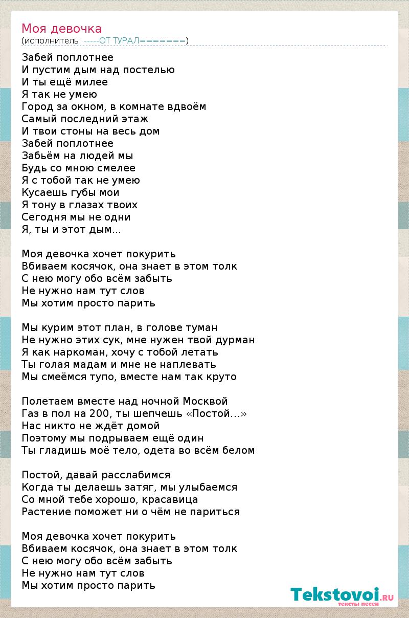 Забей поплотнее И пустим дым над постелью И ты ещё милее Я так не умею Город за окном, в комнате вдвоём Самый последний этаж И твои стоны на весь дом Забей поплотнее Забьём на людей мы Будь со мною смелее Я с тобой так не умею Кусаешь губы мои Я тону в глазах твоих Сегодня мы не одни Я, ты и этот дым... Моя девочка хочет покурить Вбиваем косячок, она знает в этом толк С нею могу обо всём забыть Не нужно нам тут слов Мы хотим просто парить Мы курим этот план, в голове туман Не нужно этих сук, мне нужен твой дурман Я как наркоман, хочу с тобой летать Ты голая мадам и мне не наплевать Мы смеёмся тупо, вместе нам так круто Полетаем вместе над ночной Москвой Газ в пол на 200, ты шепчешь «Постой…» Нас никто не ждёт домой Поэтому мы подрываем ещё один Ты гладишь моё тело, одета во всём белом Постой, давай расслабимся Когда ты делаешь затяг, мы улыбаемся Со мной тебе хорошо, красавица Растение поможет ни о чём не париться Моя девочка хочет покурить Вбиваем косячок, она знает в этом толк С нею могу обо всём забыть Не нужно нам тут слов Мы хотим просто парить