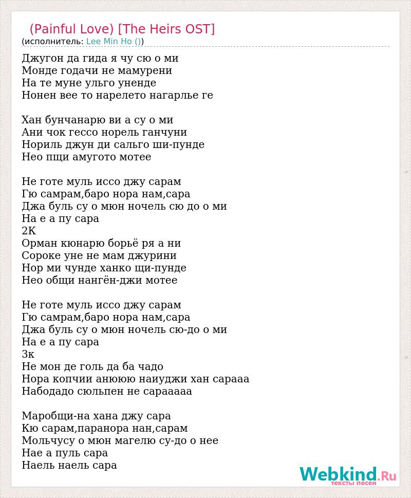 Джугон да гида я чу сю о ми Монде годачи не мамурени На те муне ульго уненде Нонен вее то нарелето нагарлье ге Хан бунчанарю ви а су о ми Ани чок гессо норель ганчуни Нориль джун ди сальго ши-пунде Нео пщи амугото мотее Не готе муль иссо джу сарам Гю самрам,баро нора нам,сара Джа буль су о мюн ночель сю до о ми На е а пу сара 2К Орман кюнарю борьё ря а ни Сороке уне не мам джурини Нор ми чунде ханко щи-пунде Нео общи нангён-джи мотее Не готе муль иссо джу сарам Гю самрам,баро нора нам,сара Джа буль су о мюн ночель сю-до о ми На е а пу сара 3к Не мон де голь да ба чадо Нора копчии анююю наиуджи хан сарааа Набодадо сюльпен не сарааааа Маробщи-на хана джу сара Кю сарам,паранора нан,сарам Мольчусу о мюн магелю су-до о нее Нае а пуль сара Наель наель сара