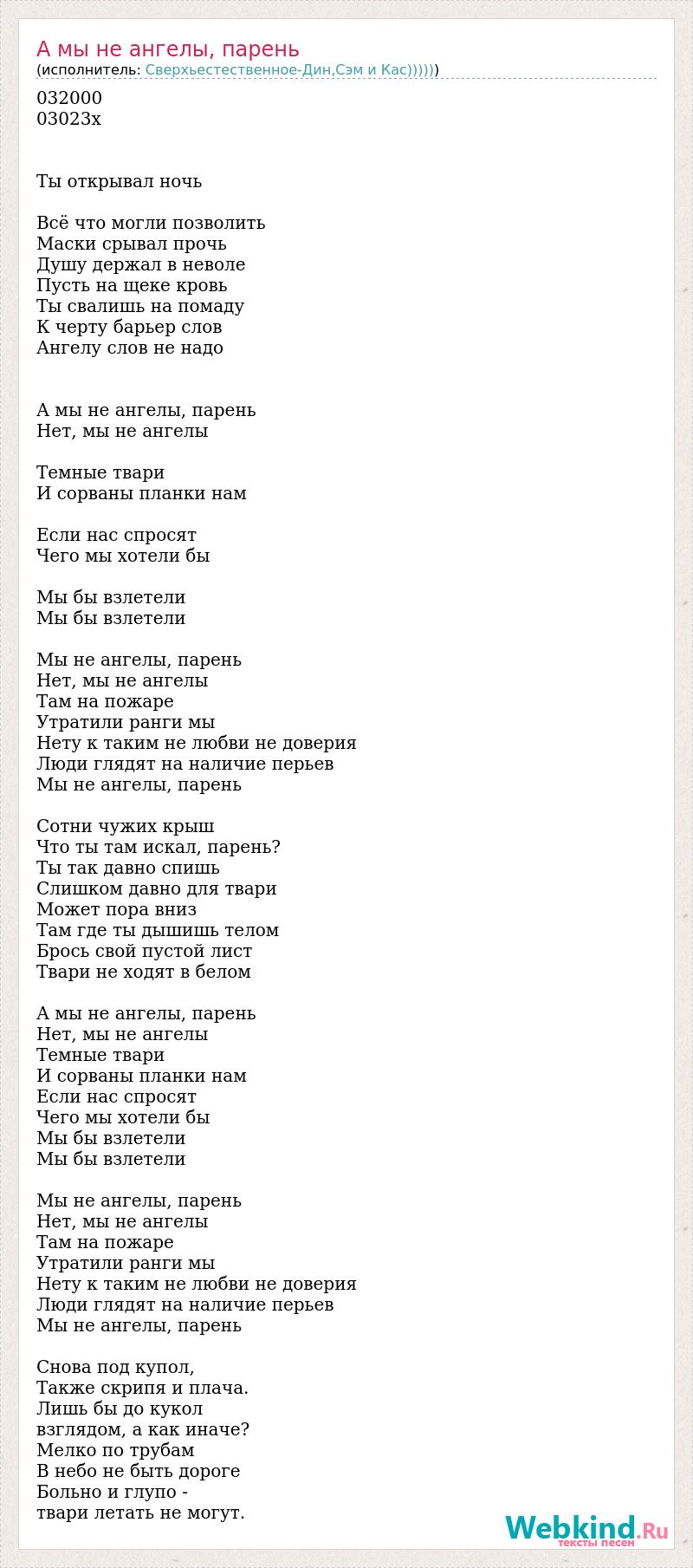 032000 03023x Ты открывал ночь Всё что могли позволить Маски срывал прочь Душу держал в неволе Пусть на щеке кровь Ты свалишь на помаду К черту барьер слов Ангелу слов не надо А мы не ангелы, парень Нет, мы не ангелы Темные твари И сорваны планки нам Если нас спросят Чего мы хотели бы Мы бы взлетели Мы бы взлетели Мы не ангелы, парень Нет, мы не ангелы Там на пожаре Утратили ранги мы Нету к таким не любви не доверия Люди глядят на наличие перьев Мы не ангелы, парень Сотни чужих крыш Что ты там искал, парень? Ты так давно спишь Слишком давно для твари Может пора вниз Там где ты дышишь телом Брось свой пустой лист Твари не ходят в белом А мы не ангелы, парень Нет, мы не ангелы Темные твари И сорваны планки нам Если нас спросят Чего мы хотели бы Мы бы взлетели Мы бы взлетели Мы не ангелы, парень Нет, мы не ангелы Там на пожаре Утратили ранги мы Нету к таким не любви не доверия Люди глядят на наличие перьев Мы не ангелы, парень Снова под купол, Также скрипя и плача. Лишь бы до кукол взглядом, а как иначе? Мелко по трубам В небо не быть дороге Больно и глупо - твари летать не могут.