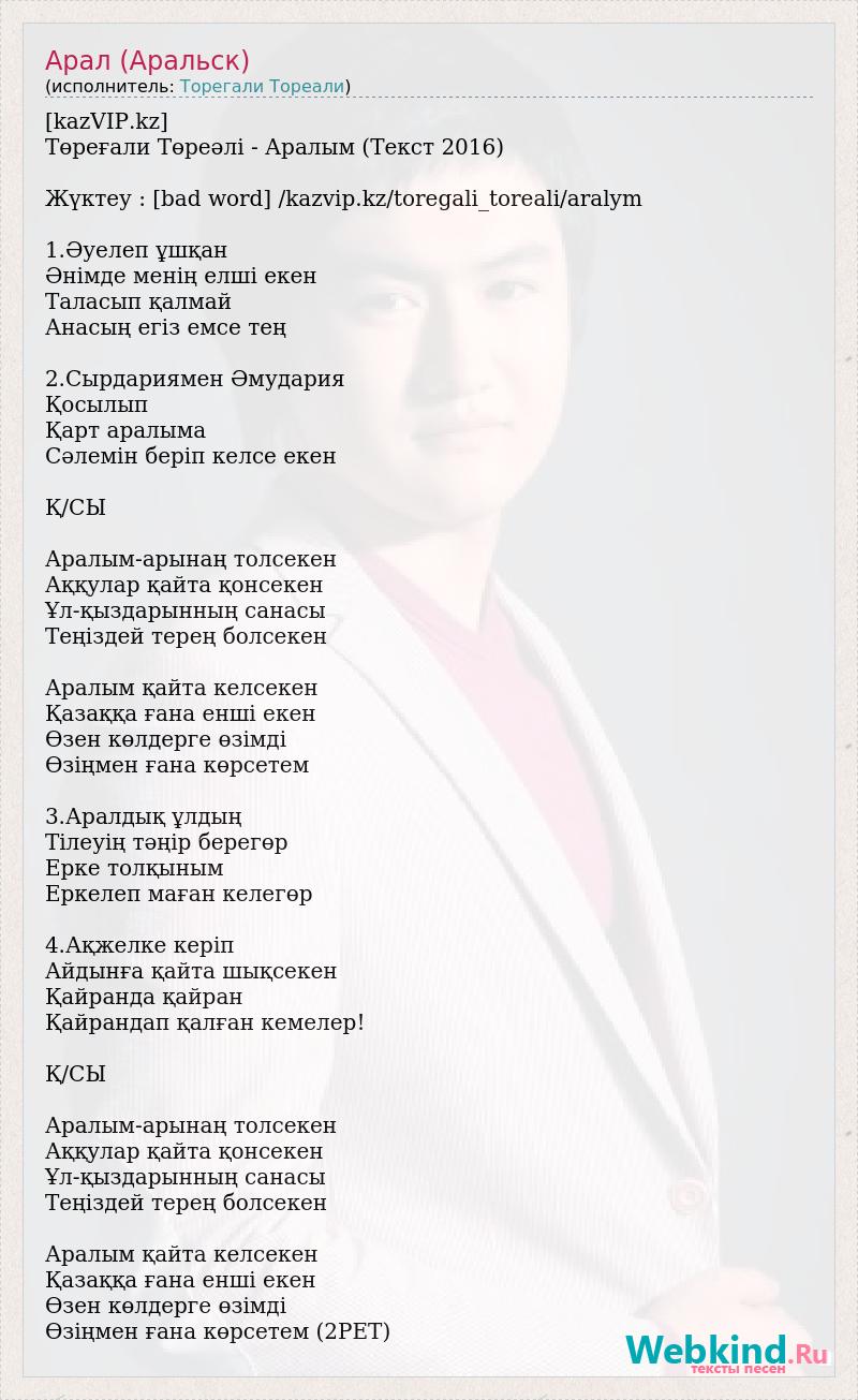 [kazVIP.kz] Төреғали Төреәлі - Аралым (Текст 2016) 💾Жүктеу : [bad word] /kazvip.kz/toregali_toreali/aralym 1.Әуелеп ұшқан Әнімде менің елші екен Таласып қалмай Анасың егіз емсе тең 2.Сырдариямен Әмудария Қосылып Қарт аралыма Сәлемін беріп келсе екен Қ/СЫ Аралым-арынаң толсекен Аққулар қайта қонсекен Ұл-қыздарынның санасы Теңіздей терең болсекен Аралым қайта келсекен Қазаққа ғана енші екен Өзен көлдерге өзімді Өзіңмен ғана көрсетем 3.Аралдық ұлдың Тілеуің тәңір берегөр Ерке толқыным Еркелеп маған келегөр 4.Ақжелке керіп Айдынға қайта шықсекен Қайранда қайран Қайрандап қалған кемелер! Қ/СЫ Аралым-арынаң толсекен Аққулар қайта қонсекен Ұл-қыздарынның санасы Теңіздей терең болсекен Аралым қайта келсекен Қазаққа ғана енші екен Өзен көлдерге өзімді Өзіңмен ғана көрсетем (2РЕТ)