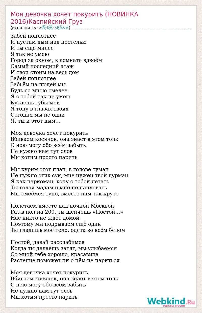 Забей поплотнее И пустим дым над постелью И ты ещё милее Я так не умею Город за окном, в комнате вдвоём Самый последний этаж И твои стоны на весь дом Забей поплотнее Забьём на людей мы Будь со мною смелее Я с тобой так не умею Кусаешь губы мои Я тону в глазах твоих Сегодня мы не одни Я, ты и этот дым... Моя девочка хочет покурить Вбиваем косячок, она знает в этом толк С нею могу обо всём забыть Не нужно нам тут слов Мы хотим просто парить Мы курим этот план, в голове туман Не нужно этих сук, мне нужен твой дурман Я как наркоман, хочу с тобой летать Ты голая мадам и мне не наплевать Мы смеёмся тупо, вместе нам так круто Полетаем вместе над ночной Москвой Газ в пол на 200, ты шепчешь «Постой…» Нас никто не ждёт домой Поэтому мы подрываем ещё один Ты гладишь моё тело, одета во всём белом Постой, давай расслабимся Когда ты делаешь затяг, мы улыбаемся Со мной тебе хорошо, красавица Растение поможет ни о чём не париться Моя девочка хочет покурить Вбиваем косячок, она знает в этом толк С нею могу обо всём забыть Не нужно нам тут слов Мы хотим просто парить