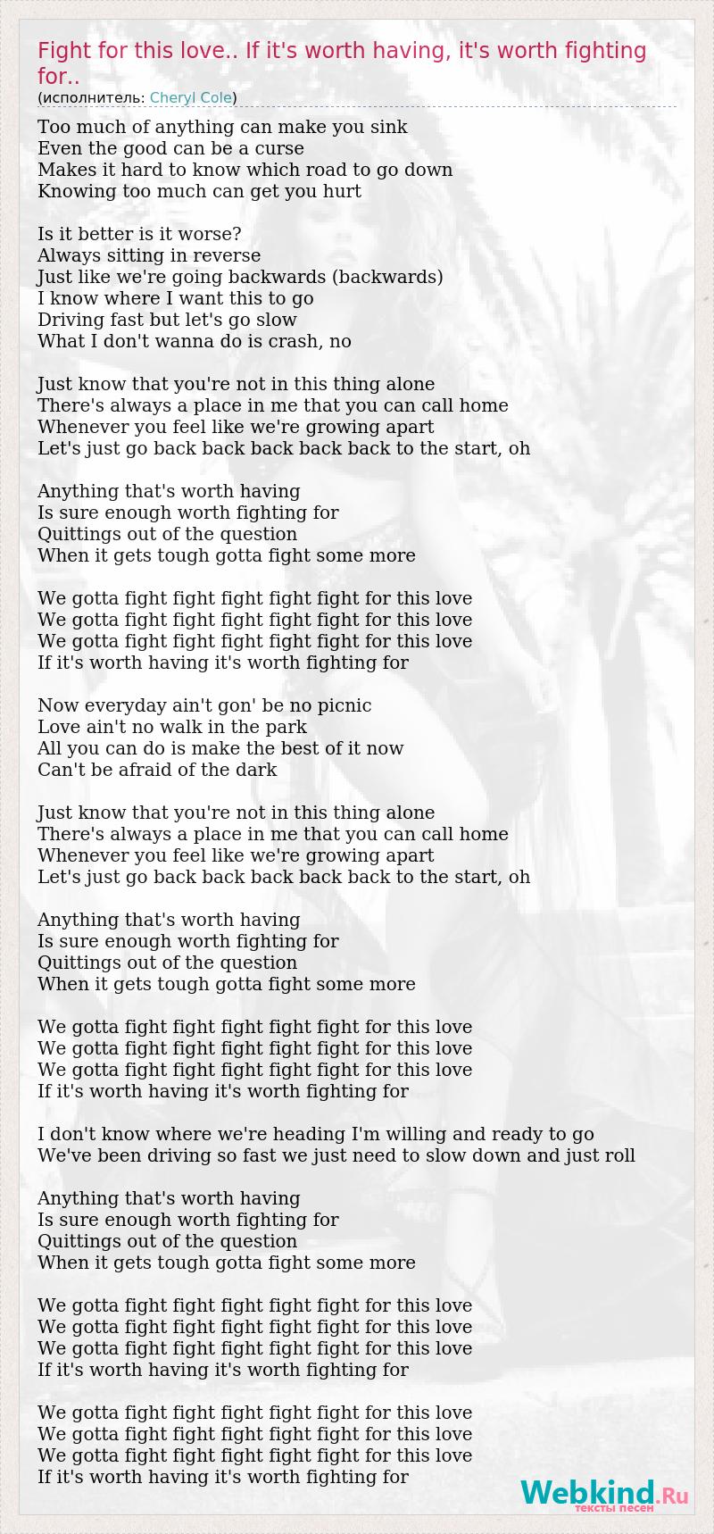 Too much of anything can make you sink Even the good can be a curse Makes it hard to know which road to go down Knowing too much can get you hurt Is it better is it worse? Always sitting in reverse Just like we're going backwards (backwards) I know where I want this to go Driving fast but let's go slow What I don't wanna do is crash, no Just know that you're not in this thing alone There's always a place in me that you can call home Whenever you feel like we're growing apart Let's just go back back back back back to the start, oh Anything that's worth having Is sure enough worth fighting for Quittings out of the question When it gets tough gotta fight some more We gotta fight fight fight fight fight for this love We gotta fight fight fight fight fight for this love We gotta fight fight fight fight fight for this love If it's worth having it's worth fighting for Now everyday ain't gon' be no picnic Love ain't no walk in the park All you can do is make the best of it now Can't be afraid of the dark Just know that you're not in this thing alone There's always a place in me that you can call home Whenever you feel like we're growing apart Let's just go back back back back back to the start, oh Anything that's worth having Is sure enough worth fighting for Quittings out of the question When it gets tough gotta fight some more We gotta fight fight fight fight fight for this love We gotta fight fight fight fight fight for this love We gotta fight fight fight fight fight for this love If it's worth having it's worth fighting for I don't know where we're heading I'm willing and ready to go We've been driving so fast we just need to slow down and just roll Anything that's worth having Is sure enough worth fighting for Quittings out of the question When it gets tough gotta fight some more We gotta fight fight fight fight fight for this love We gotta fight fight fight fight fight for this love We gotta fight fight fight fight fight for this love If it's worth having it's worth fighting for We gotta fight fight fight fight fight for this love We gotta fight fight fight fight fight for this love We gotta fight fight fight fight fight for this love If it's worth having it's worth fighting for
