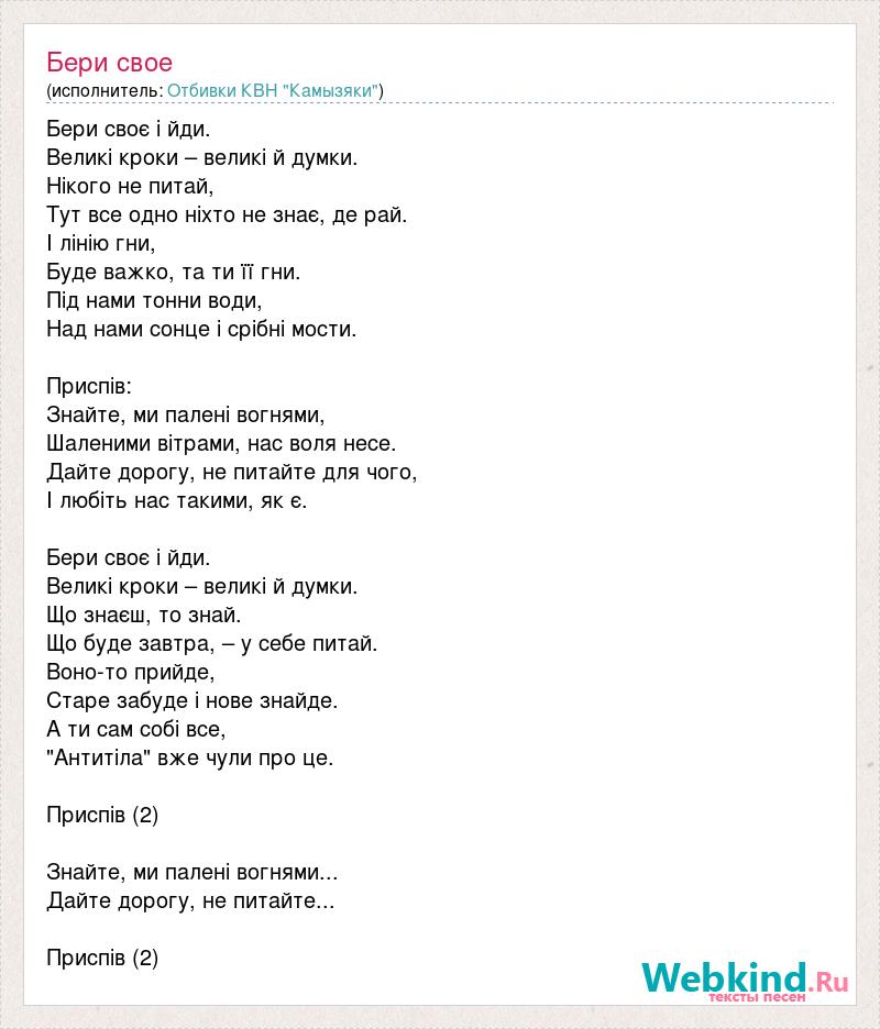 Бери своє і йди. Великі кроки – великі й думки. Нікого не питай, Тут все одно ніхто не знає, де рай. І лінію гни, Буде важко, та ти її гни. Під нами тонни води, Над нами сонце і срібні мости. Приспів: Знайте, ми палені вогнями, Шаленими вітрами, нас воля несе. Дайте дорогу, не питайте для чого, І любіть нас такими, як є. Бери своє і йди. Великі кроки – великі й думки. Що знаєш, то знай. Що буде завтра, – у себе питай. Воно-то прийде, Старе забуде і нове знайде. А ти сам собі все, "Антитіла" вже чули про це. Приспів (2) Знайте, ми палені вогнями... Дайте дорогу, не питайте... Приспів (2)