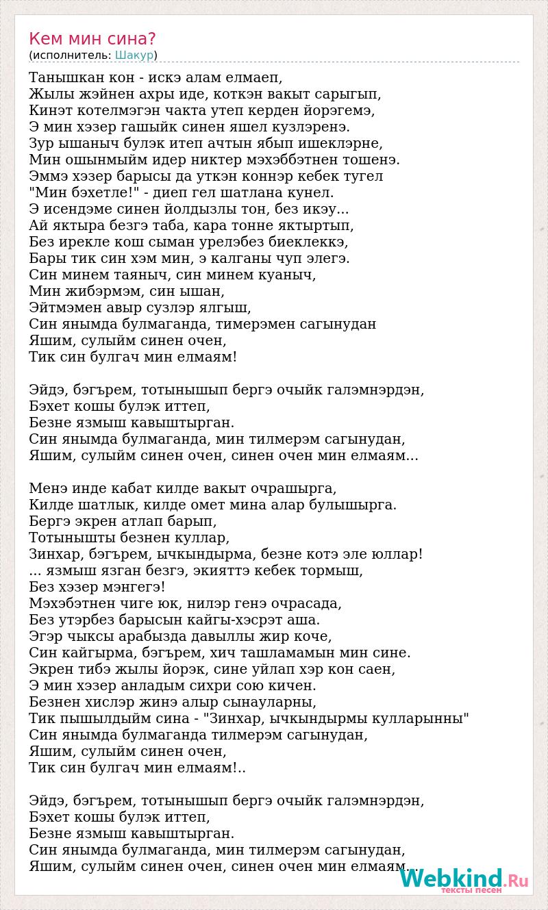 Танышкан кон - искэ алам елмаеп, Жылы жэйнен ахры иде, коткэн вакыт сарыгып, Кинэт котелмэгэн чакта утеп керден йорэгемэ, Э мин хэзер гашыйк синен яшел кузлэренэ. Зур ышаныч булэк итеп ачтын ябып ишеклэрне, Мин ошынмыйм идер никтер мэхэббэтнен тошенэ. Эммэ хэзер барысы да уткэн коннэр кебек тугел "Мин бэхетле!" - диеп гел шатлана кунел. Э исендэме синен йолдызлы тон, без икэу... Ай яктыра безгэ таба, кара тонне яктыртып, Без ирекле кош сыман урелэбез биеклеккэ, Бары тик син хэм мин, э калганы чуп элегэ. Син минем таяныч, син минем куаныч, Мин жибэрмэм, син ышан, Эйтмэмен авыр сузлэр ялгыш, Син янымда булмаганда, тимерэмен сагынудан Яшим, сулыйм синен очен, Тик син булгач мин елмаям! Эйдэ, бэгърем, тотынышып бергэ очыйк галэмнэрдэн, Бэхет кошы булэк иттеп, Безне язмыш кавыштырган. Син янымда булмаганда, мин тилмерэм сагынудан, Яшим, сулыйм синен очен, синен очен мин елмаям... Менэ инде кабат килде вакыт очрашырга, Килде шатлык, килде омет мина алар булышырга. Бергэ экрен атлап барып, Тотынышты безнен куллар, Зинхар, бэгърем, ычкындырма, безне котэ эле юллар! ... язмыш язган безгэ, экияттэ кебек тормыш, Без хэзер мэнгегэ! Мэхэбэтнен чиге юк, нилэр генэ очрасада, Без утэрбез барысын кайгы-хэсрэт аша. Эгэр чыксы арабызда давыллы жир коче, Син кайгырма, бэгърем, хич ташламамын мин сине. Экрен тибэ жылы йорэк, сине уйлап хэр кон саен, Э мин хэзер анладым сихри сою кичен. Безнен хислэр жинэ алыр сынауларны, Тик пышылдыйм сина - "Зинхар, ычкындырмы кулларынны" Син янымда булмаганда тилмерэм сагынудан, Яшим, сулыйм синен очен, Тик син булгач мин елмаям!.. Эйдэ, бэгърем, тотынышып бергэ очыйк галэмнэрдэн, Бэхет кошы булэк иттеп, Безне язмыш кавыштырган. Син янымда булмаганда, мин тилмерэм сагынудан, Яшим, сулыйм синен очен, синен очен мин елмаям...
