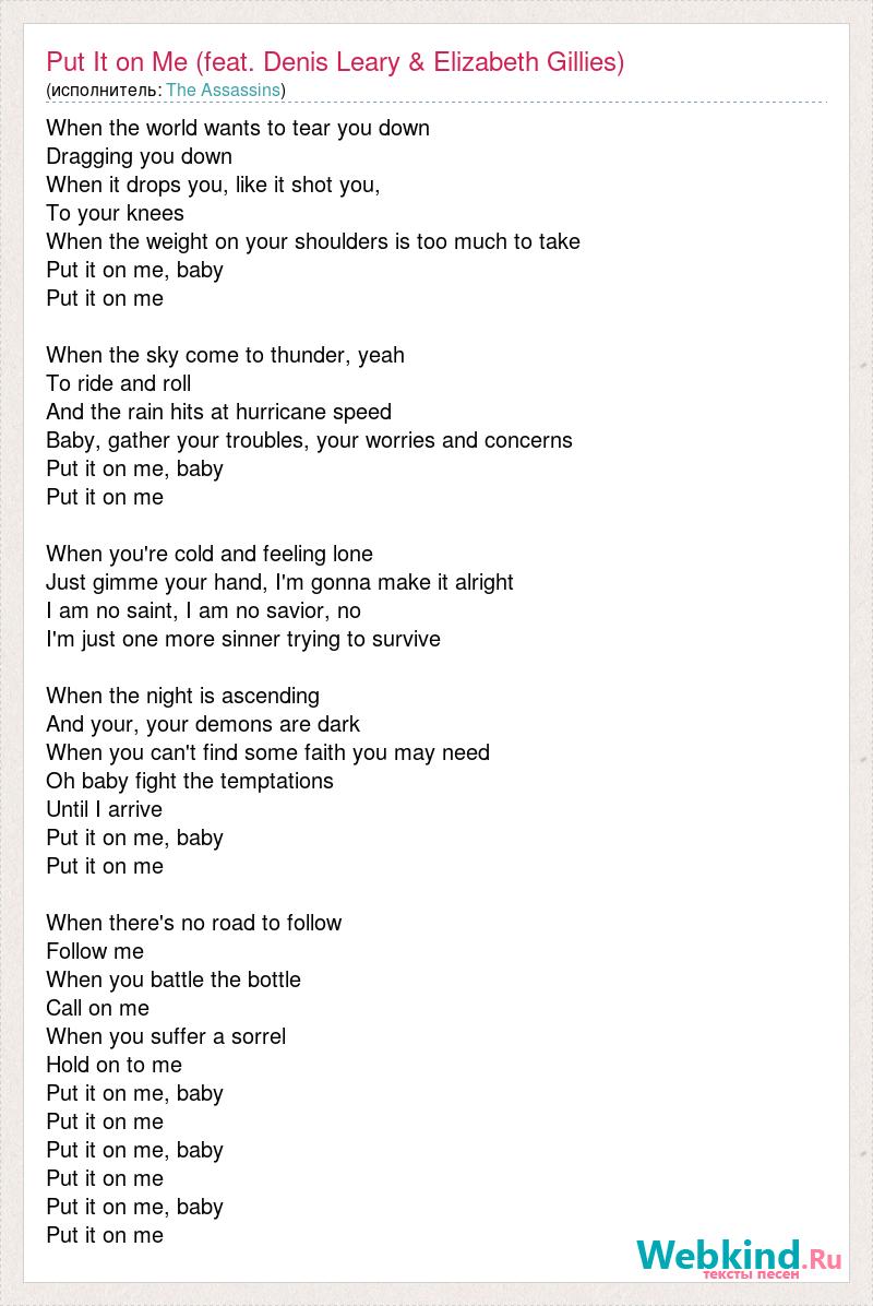 When the world wants to tear you down Dragging you down When it drops you, like it shot you, To your knees When the weight on your shoulders is too much to take Put it on me, baby Put it on me When the sky come to thunder, yeah To ride and roll And the rain hits at hurricane speed Baby, gather your troubles, your worries and concerns Put it on me, baby Put it on me When you're cold and feeling lone Just gimme your hand, I'm gonna make it alright I am no saint, I am no savior, no I'm just one more sinner trying to survive When the night is ascending And your, your demons are dark When you can't find some faith you may need Oh baby fight the temptations Until I arrive Put it on me, baby Put it on me When there's no road to follow Follow me When you battle the bottle Call on me When you suffer a sorrel Hold on to me Put it on me, baby Put it on me Put it on me, baby Put it on me Put it on me, baby Put it on me