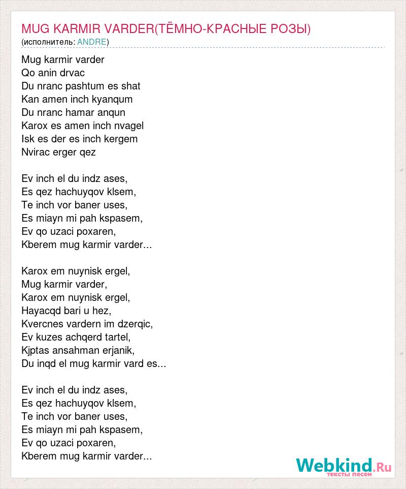 Mug karmir varder Qo anin drvac Du nranc pashtum es shat Kan amen inch kyanqum Du nranc hamar anqun Karox es amen inch nvagel Isk es der es inch kergem Nvirac erger qez Ev inch el du indz ases, Es qez hachuyqov klsem, Te inch vor baner uses, Es miayn mi pah kspasem, Ev qo uzaci poxaren, Kberem mug karmir varder... Karox em nuynisk ergel, Mug karmir varder, Karox em nuynisk ergel, Hayacqd bari u hez, Kvercnes vardern im dzerqic, Ev kuzes achqerd tartel, Kjptas ansahman erjanik, Du inqd el mug karmir vard es... Ev inch el du indz ases, Es qez hachuyqov klsem, Te inch vor baner uses, Es miayn mi pah kspasem, Ev qo uzaci poxaren, Kberem mug karmir varder...
