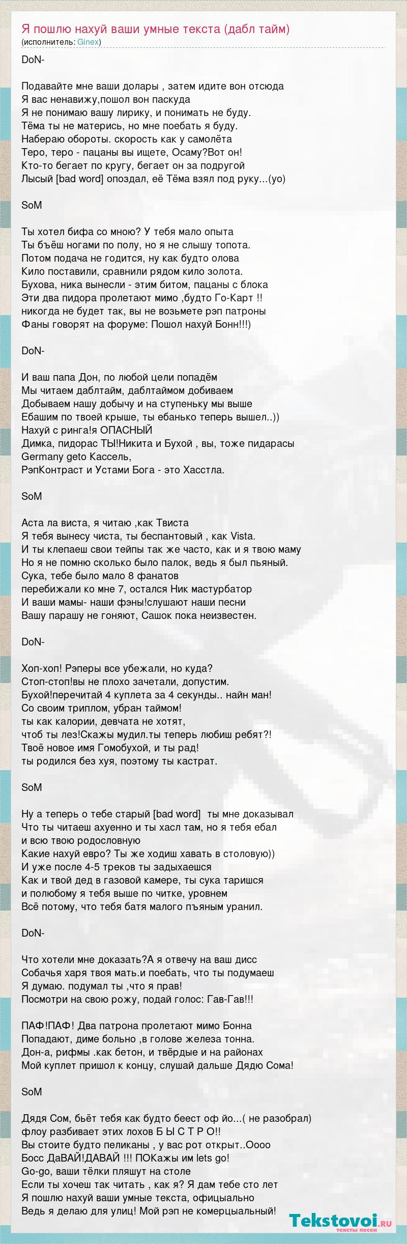 DoN- Подавайте мне ваши долары , затем идите вон отсюда Я вас ненавижу,пошол вон паскуда Я не понимаю вашу лирику, и понимать не буду. Тёма ты не матерись, но мне поебать я буду. Набераю обороты. скорость как у самолёта Теро, теро - пацаны вы ищете, Осаму?Вот он! Кто-то бегает по кругу, бегает он за подругой Лысый [bad word] опоздал, её Тёма взял под руку...(yo) SoM Ты хотел бифа со мною? У тебя мало опыта Ты бъёш ногами по полу, но я не слышу топота. Потом подача не годится, ну как будто олова Кило поставили, сравнили рядом кило золота. Бухова, ника вынесли - этим битом, пацаны с блока Эти два пидора пролетают мимо ,будто Го-Карт !! никогда не будет так, вы не возьмете рэп патроны Фаны говорят на форуме: Пошол нахуй Бонн!!!) DoN- И ваш папа Дон, по любой цели попадём Мы читаем даблтайм, даблтаймом добиваем Добываем нашу добычу и на ступеньку мы выше Ебашим по твоей крыше, ты ебанько теперь вышел..)) Нахуй с ринга!я ОПАСНЫЙ Димка, пидорас ТЫ!Никита и Бухой , вы, тоже пидарасы Germany geto Кассель, РэпКонтраст и Устами Бога - это Хасстла. SoM Аста ла виста, я читаю ,как Твиста Я тебя вынесу чиста, ты беспантовый , как Vista. И ты клепаеш свои тейпы так же часто, как и я твою маму Но я не помню сколько было палок, ведь я был пьяный. Сука, тебе было мало 8 фанатов перебижали ко мне 7, остался Ник мастурбатор И ваши мамы- наши фэны!слушают наши песни Вашу парашу не гоняют, Сашок пока неизвестен. DoN- Хоп-хоп! Рэперы все убежали, но куда? Стоп-стоп!вы не плохо зачетали, допустим. Бухой!перечитай 4 куплета за 4 секунды.. найн ман! Со своим триплом, убран таймом! ты как калории, девчата не хотят, чтоб ты лез!Скажы мудил.ты теперь любиш ребят?! Твоё новое имя Гомобухой, и ты рад! ты родился без хуя, поэтому ты кастрат. SoM Ну а теперь о тебе старый [bad word] ты мне доказывал Что ты читаеш ахуенно и ты хасл там, но я тебя ебал и всю твою родословную Какие нахуй евро? Ты же ходиш хавать в столовую)) И уже после 4-5 треков ты задыхаешся Как и твой дед в газовой камере, ты сука таришся и полюбому я тебя выше по читке, уровнем Всё потому, что тебя батя малого пъяным уранил. DoN- Что хотели мне доказать?А я отвечу на ваш дисс Собачья харя твоя мать.и поебать, что ты подумаеш Я думаю. подумал ты ,что я прав! Посмотри на свою рожу, подай голос: Гав-Гав!!! ПАФ!ПАФ! Два патрона пролетают мимо Бонна Попадают, диме больно ,в голове железа тонна. Дон-а, рифмы .как бетон, и твёрдые и на районах Мой куплет пришол к концу, слушай дальше Дядю Сома! SoM Дядя Сом, бьёт тебя как будто беест оф йо...( не разобрал) флоу разбивает этих лохов Б Ы С Т Р О!! Вы стоите будто пеликаны , у вас рот открыт..Оооо Босс ДаВАЙ!ДАВАЙ !!! ПОКажы им lets go! Go-go, ваши тёлки пляшут на столе Если ты хочеш так читать , как я? Я дам тебе сто лет Я пошлю нахуй ваши умные текста, офицыально Ведь я делаю для улиц! Мой рэп не комерцыальный!