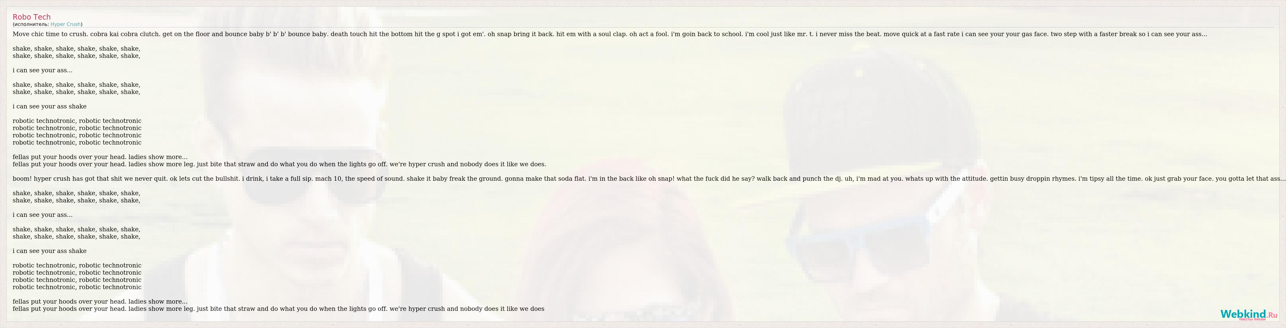 Move chic time to crush. cobra kai cobra clutch. get on the floor and bounce baby b' b' b' bounce baby. death touch hit the bottom hit the g spot i got em'. oh snap bring it back. hit em with a soul clap. oh act a fool. i'm goin back to school. i'm cool just like mr. t. i never miss the beat. move quick at a fast rate i can see your your gas face. two step with a faster break so i can see your ass... shake, shake, shake, shake, shake, shake, shake, shake, shake, shake, shake, shake, i can see your ass... shake, shake, shake, shake, shake, shake, shake, shake, shake, shake, shake, shake, i can see your ass shake robotic technotronic, robotic technotronic robotic technotronic, robotic technotronic robotic technotronic, robotic technotronic robotic technotronic, robotic technotronic fellas put your hoods over your head. ladies show more... fellas put your hoods over your head. ladies show more leg. just bite that straw and do what you do when the lights go off. we're hyper crush and nobody does it like we does. boom! hyper crush has got that shit we never quit. ok lets cut the bullshit. i drink, i take a full sip. mach 10, the speed of sound. shake it baby freak the ground. gonna make that soda flat. i'm in the back like oh snap! what the fuck did he say? walk back and punch the dj. uh, i'm mad at you. whats up with the attitude. gettin busy droppin rhymes. i'm tipsy all the time. ok just grab your face. you gotta let that ass... shake, shake, shake, shake, shake, shake, shake, shake, shake, shake, shake, shake, i can see your ass... shake, shake, shake, shake, shake, shake, shake, shake, shake, shake, shake, shake, i can see your ass shake robotic technotronic, robotic technotronic robotic technotronic, robotic technotronic robotic technotronic, robotic technotronic robotic technotronic, robotic technotronic fellas put your hoods over your head. ladies show more... fellas put your hoods over your head. ladies show more leg. just bite that straw and do what you do when the lights go off. we're hyper crush and nobody does it like we does