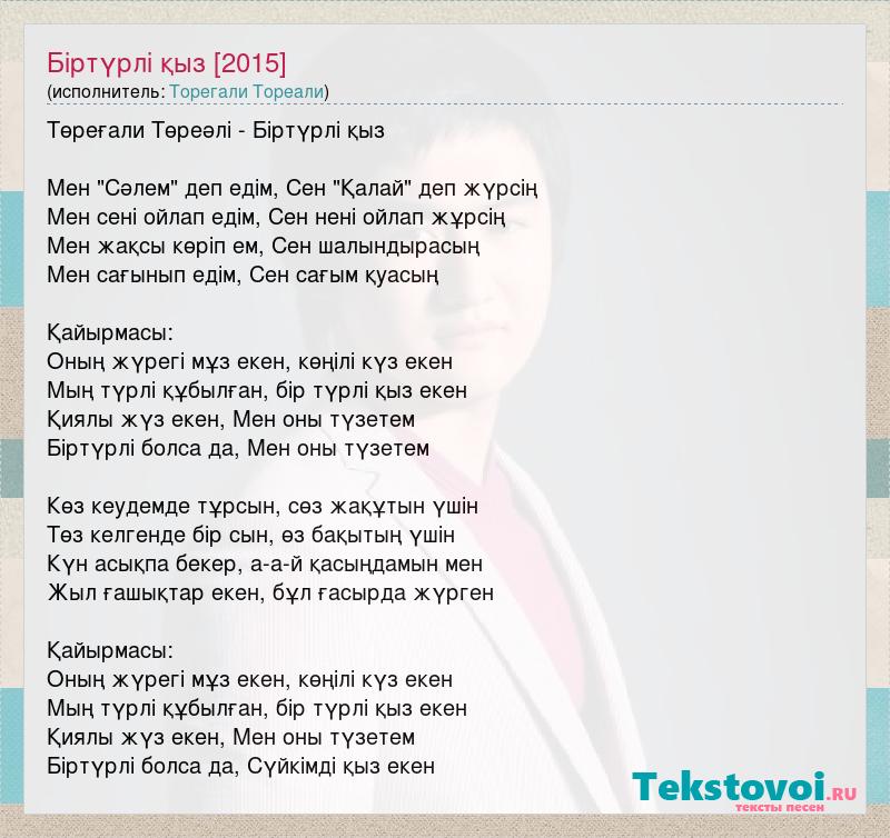 Төреғали Төреәлі - Біртүрлі қыз Мен "Сәлем" деп едім, Сен "Қалай" деп жүрсің Мен сені ойлап едім, Сен нені ойлап жұрсің Мен жақсы көріп ем, Сен шалындырасың Мен сағынып едім, Сен сағым қуасың Қайырмасы: Оның жүрегі мұз екен, көңілі күз екен Мың түрлі құбылған, бір түрлі қыз екен Қиялы жүз екен, Мен оны түзетем Біртүрлі болса да, Мен оны түзетем Көз кеудемде тұрсын, сөз жақұтын үшін Төз келгенде бір сын, өз бақытың үшін Күн асықпа бекер, а-а-й қасыңдамын мен Жыл ғашықтар екен, бұл ғасырда жүрген Қайырмасы: Оның жүрегі мұз екен, көңілі күз екен Мың түрлі құбылған, бір түрлі қыз екен Қиялы жүз екен, Мен оны түзетем Біртүрлі болса да, Сүйкімді қыз екен