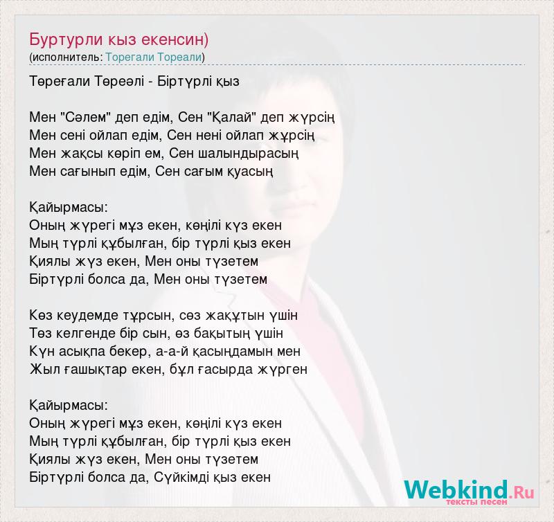 Төреғали Төреәлі - Біртүрлі қыз Мен "Сәлем" деп едім, Сен "Қалай" деп жүрсің Мен сені ойлап едім, Сен нені ойлап жұрсің Мен жақсы көріп ем, Сен шалындырасың Мен сағынып едім, Сен сағым қуасың Қайырмасы: Оның жүрегі мұз екен, көңілі күз екен Мың түрлі құбылған, бір түрлі қыз екен Қиялы жүз екен, Мен оны түзетем Біртүрлі болса да, Мен оны түзетем Көз кеудемде тұрсын, сөз жақұтын үшін Төз келгенде бір сын, өз бақытың үшін Күн асықпа бекер, а-а-й қасыңдамын мен Жыл ғашықтар екен, бұл ғасырда жүрген Қайырмасы: Оның жүрегі мұз екен, көңілі күз екен Мың түрлі құбылған, бір түрлі қыз екен Қиялы жүз екен, Мен оны түзетем Біртүрлі болса да, Сүйкімді қыз екен