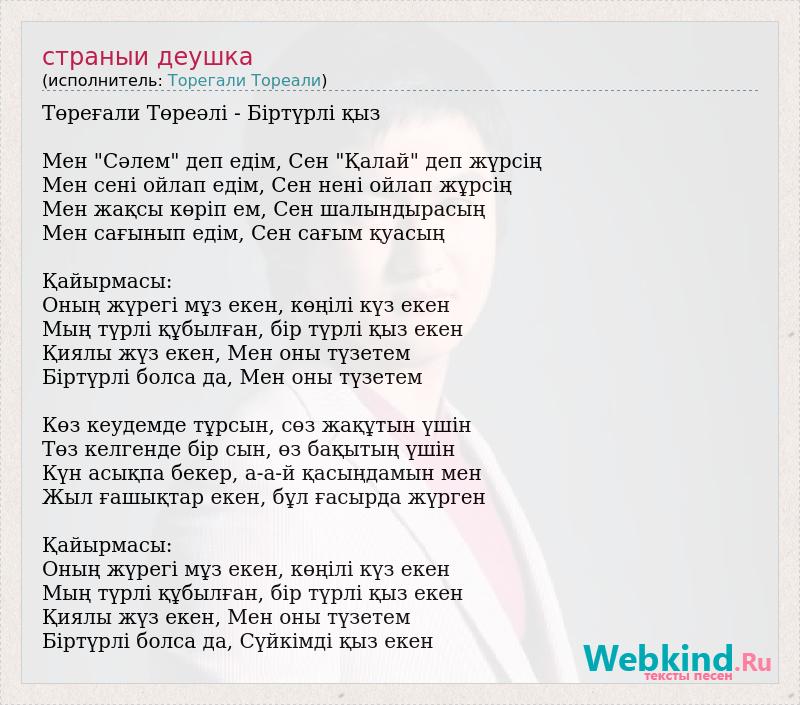 Төреғали Төреәлі - Біртүрлі қыз Мен "Сәлем" деп едім, Сен "Қалай" деп жүрсің Мен сені ойлап едім, Сен нені ойлап жұрсің Мен жақсы көріп ем, Сен шалындырасың Мен сағынып едім, Сен сағым қуасың Қайырмасы: Оның жүрегі мұз екен, көңілі күз екен Мың түрлі құбылған, бір түрлі қыз екен Қиялы жүз екен, Мен оны түзетем Біртүрлі болса да, Мен оны түзетем Көз кеудемде тұрсын, сөз жақұтын үшін Төз келгенде бір сын, өз бақытың үшін Күн асықпа бекер, а-а-й қасыңдамын мен Жыл ғашықтар екен, бұл ғасырда жүрген Қайырмасы: Оның жүрегі мұз екен, көңілі күз екен Мың түрлі құбылған, бір түрлі қыз екен Қиялы жүз екен, Мен оны түзетем Біртүрлі болса да, Сүйкімді қыз екен
