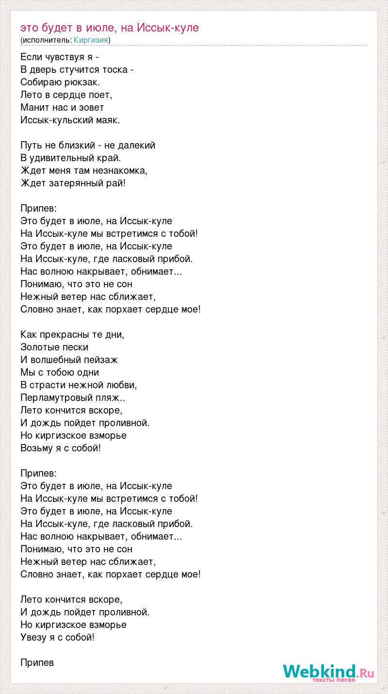 Если чувствуя я - В дверь стучится тоска - Собираю рюкзак. Лето в сердце поет, Манит нас и зовет Иссык-кульский маяк. Путь не близкий - не далекий В удивительный край. Ждет меня там незнакомка, Ждет затерянный рай! Припев: Это будет в июле, на Иссык-куле На Иссык-куле мы встретимся с тобой! Это будет в июле, на Иссык-куле На Иссык-куле, где ласковый прибой. Нас волною накрывает, обнимает... Понимаю, что это не сон Нежный ветер нас сближает, Словно знает, как порхает сердце мое! Как прекрасны те дни, Золотые пески И волшебный пейзаж Мы с тобою одни В страсти нежной любви, Перламутровый пляж.. Лето кончится вскоре, И дождь пойдет проливной. Но киргизское взморье Возьму я с собой! Припев: Это будет в июле, на Иссык-куле На Иссык-куле мы встретимся с тобой! Это будет в июле, на Иссык-куле На Иссык-куле, где ласковый прибой. Нас волною накрывает, обнимает... Понимаю, что это не сон Нежный ветер нас сближает, Словно знает, как порхает сердце мое! Лето кончится вскоре, И дождь пойдет проливной. Но киргизское взморье Увезу я с собой! Припев