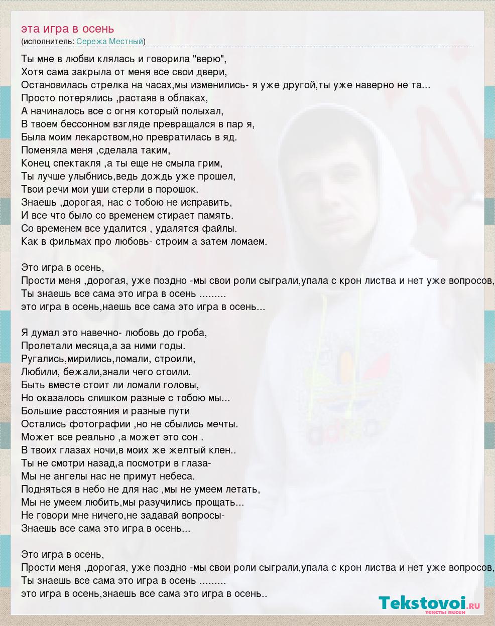 Ты мне в любви клялась и говорила "верю", Хотя сама закрыла от меня все свои двери, Остановилась стрелка на часах,мы изменились- я уже другой,ты уже наверно не та... Просто потерялись ,растаяв в облаках, А начиналось все с огня который полыхал, В твоем бессонном взгляде превращался в пар я, Была моим лекарством,но превратилась в яд. Поменяла меня ,сделала таким, Конец спектакля ,а ты еще не смыла грим, Ты лучше улыбнись,ведь дождь уже прошел, Твои речи мои уши стерли в порошок. Знаешь ,дорогая, нас с тобою не исправить, И все что было со временем стирает память. Со временем все удалится , удалятся файлы. Как в фильмах про любовь- строим а затем ломаем. Это игра в осень, Прости меня ,дорогая, уже поздно -мы свои роли сыграли,упала с крон листва и нет уже вопросов, Ты знаешь все сама это игра в осень ......... это игра в осень,наешь все сама это игра в осень... Я думал это навечно- любовь до гроба, Пролетали месяца,а за ними годы. Ругались,мирились,ломали, строили, Любили, бежали,знали чего стоили. Быть вместе стоит ли ломали головы, Но оказалось слишком разные с тобою мы... Большие расстояния и разные пути Остались фотографии ,но не сбылись мечты. Может все реально ,а может это сон . В твоих глазах ночи,в моих же желтый клен.. Ты не смотри назад,а посмотри в глаза- Мы не ангелы нас не примут небеса. Подняться в небо не для нас ,мы не умеем летать, Мы не умеем любить,мы разучились прощать... Не говори мне ничего,не задавай вопросы- Знаешь все сама это игра в осень... Это игра в осень, Прости меня ,дорогая, уже поздно -мы свои роли сыграли,упала с крон листва и нет уже вопросов, Ты знаешь все сама это игра в осень ......... это игра в осень,знаешь все сама это игра в осень..