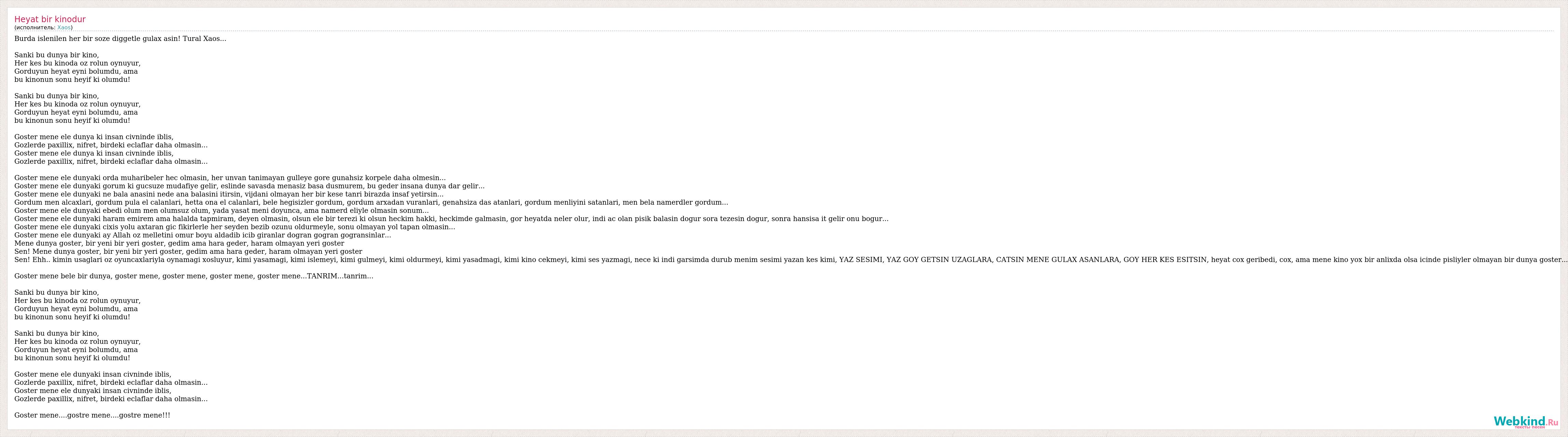 Burda islenilen her bir soze diggetle gulax asin! Tural Xaos... Sanki bu dunya bir kino, Her kes bu kinoda oz rolun oynuyur, Gorduyun heyat eyni bolumdu, ama bu kinonun sonu heyif ki olumdu! Sanki bu dunya bir kino, Her kes bu kinoda oz rolun oynuyur, Gorduyun heyat eyni bolumdu, ama bu kinonun sonu heyif ki olumdu! Goster mene ele dunya ki insan civninde iblis, Gozlerde paxillix, nifret, birdeki eclaflar daha olmasin... Goster mene ele dunya ki insan civninde iblis, Gozlerde paxillix, nifret, birdeki eclaflar daha olmasin... Goster mene ele dunyaki orda muharibeler hec olmasin, her unvan tanimayan gulleye gore gunahsiz korpele daha olmesin... Goster mene ele dunyaki gorum ki gucsuze mudafiye gelir, eslinde savasda menasiz basa dusmurem, bu geder insana dunya dar gelir... Goster mene ele dunyaki ne bala anasini nede ana balasini itirsin, vijdani olmayan her bir kese tanri birazda insaf yetirsin... Gordum men alcaxlari, gordum pula el calanlari, hetta ona el calanlari, bele hegisizler gordum, gordum arxadan vuranlari, genahsiza das atanlari, gordum menliyini satanlari, men bela namerdler gordum... Goster mene ele dunyaki ebedi olum men olumsuz olum, yada yasat meni doyunca, ama namerd eliyle olmasin sonum... Goster mene ele dunyaki haram emirem ama halalda tapmiram, deyen olmasin, olsun ele bir terezi ki olsun heckim hakki, heckimde galmasin, gor heyatda neler olur, indi ac olan pisik balasin dogur sora tezesin dogur, sonra hansisa it gelir onu bogur... Goster mene ele dunyaki cixis yolu axtaran gic fikirlerle her seyden bezib ozunu oldurmeyle, sonu olmayan yol tapan olmasin... Goster mene ele dunyaki ay Allah oz melletini omur boyu aldadib icib giranlar dogran gogran gogransinlar... Mene dunya goster, bir yeni bir yeri goster, gedim ama hara geder, haram olmayan yeri goster Sen! Mene dunya goster, bir yeni bir yeri goster, gedim ama hara geder, haram olmayan yeri goster Sen! Ehh.. kimin usaglari oz oyuncaxlariyla oynamagi xosluyur, kimi yasamagi, kimi islemeyi, kimi gulmeyi, kimi oldurmeyi, kimi yasadmagi, kimi kino cekmeyi, kimi ses yazmagi, nece ki indi garsimda durub menim sesimi yazan kes kimi, YAZ SESIMI, YAZ GOY GETSIN UZAGLARA, CATSIN MENE GULAX ASANLARA, GOY HER KES ESITSIN, heyat cox geribedi, cox, ama mene kino yox bir anlixda olsa icinde pisliyler olmayan bir dunya goster... Goster mene bele bir dunya, goster mene, goster mene, goster mene, goster mene...TANRIM...tanrim... Sanki bu dunya bir kino, Her kes bu kinoda oz rolun oynuyur, Gorduyun heyat eyni bolumdu, ama bu kinonun sonu heyif ki olumdu! Sanki bu dunya bir kino, Her kes bu kinoda oz rolun oynuyur, Gorduyun heyat eyni bolumdu, ama bu kinonun sonu heyif ki olumdu! Goster mene ele dunyaki insan civninde iblis, Gozlerde paxillix, nifret, birdeki eclaflar daha olmasin... Goster mene ele dunyaki insan civninde iblis, Gozlerde paxillix, nifret, birdeki eclaflar daha olmasin... Goster mene....gostre mene....gostre mene!!!
