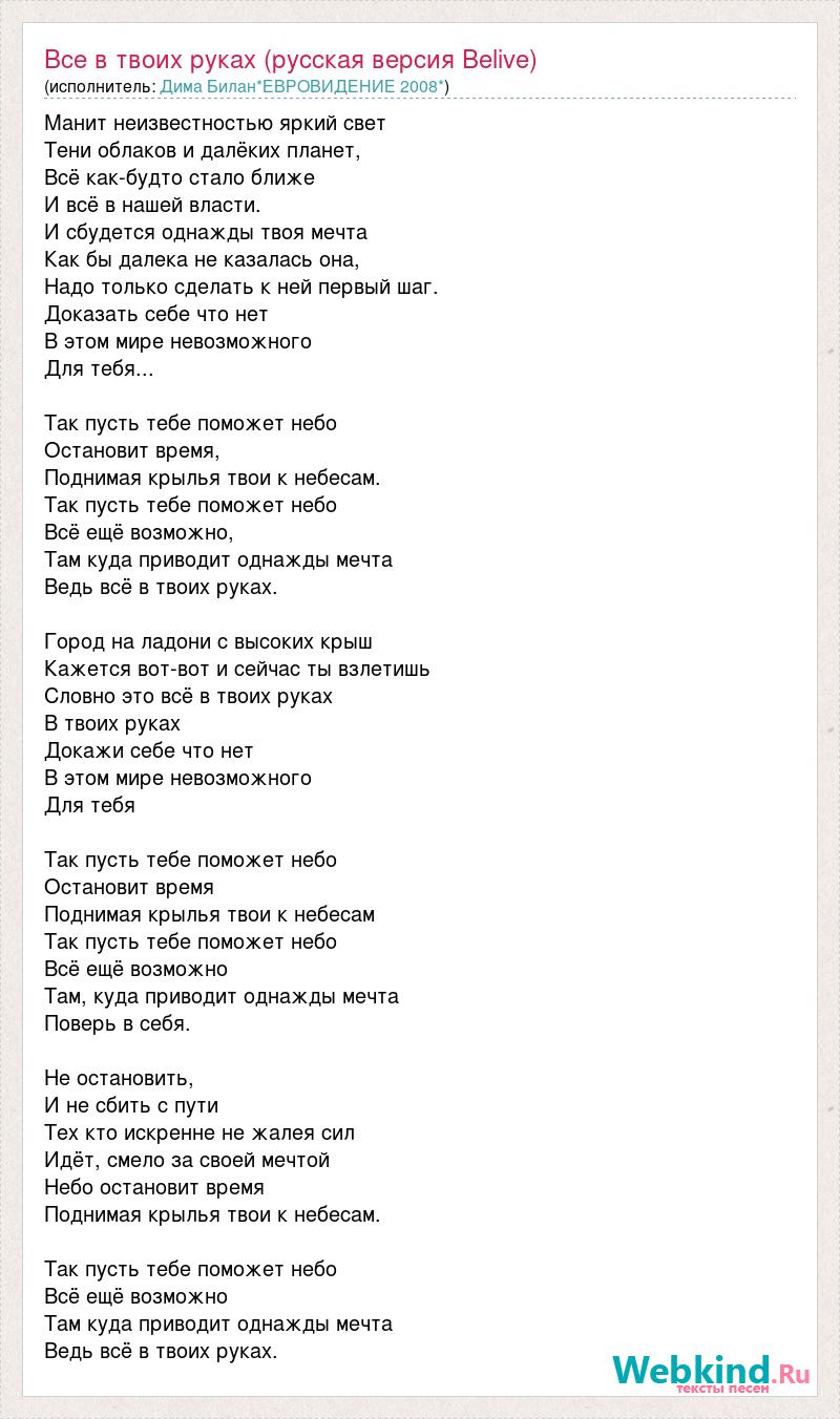 Манит неизвестностью яркий свет Тени облаков и далёких планет, Всё как-будто стало ближе И всё в нашей власти. И сбудется однажды твоя мечта Как бы далека не казалась она, Надо только сделать к ней первый шаг. Доказать себе что нет В этом мире невозможного Для тебя... Так пусть тебе поможет небо Остановит время, Поднимая крылья твои к небесам. Так пусть тебе поможет небо Всё ещё возможно, Там куда приводит однажды мечта Ведь всё в твоих руках. Город на ладони с высоких крыш Кажется вот-вот и сейчас ты взлетишь Словно это всё в твоих руках В твоих руках Докажи себе что нет В этом мире невозможного Для тебя Так пусть тебе поможет небо Остановит время Поднимая крылья твои к небесам Так пусть тебе поможет небо Всё ещё возможно Там, куда приводит однажды мечта Поверь в себя. Не остановить, И не сбить с пути Тех кто искренне не жалея сил Идёт, смело за своей мечтой Небо остановит время Поднимая крылья твои к небесам. Так пусть тебе поможет небо Всё ещё возможно Там куда приводит однажды мечта Ведь всё в твоих руках.