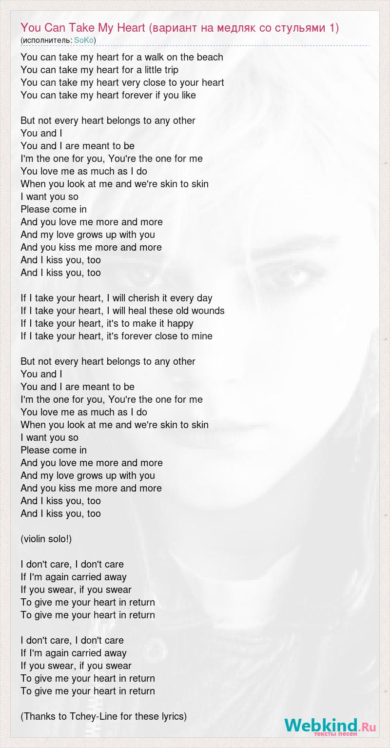 You can take my heart for a walk on the beach You can take my heart for a little trip You can take my heart very close to your heart You can take my heart forever if you like But not every heart belongs to any other You and I You and I are meant to be I'm the one for you, You're the one for me You love me as much as I do When you look at me and we're skin to skin I want you so Please come in And you love me more and more And my love grows up with you And you kiss me more and more And I kiss you, too And I kiss you, too If I take your heart, I will cherish it every day If I take your heart, I will heal these old wounds If I take your heart, it's to make it happy If I take your heart, it's forever close to mine But not every heart belongs to any other You and I You and I are meant to be I'm the one for you, You're the one for me You love me as much as I do When you look at me and we're skin to skin I want you so Please come in And you love me more and more And my love grows up with you And you kiss me more and more And I kiss you, too And I kiss you, too (violin solo!) I don't care, I don't care If I'm again carried away If you swear, if you swear To give me your heart in return To give me your heart in return I don't care, I don't care If I'm again carried away If you swear, if you swear To give me your heart in return To give me your heart in return (Thanks to Tchey-Line for these lyrics)