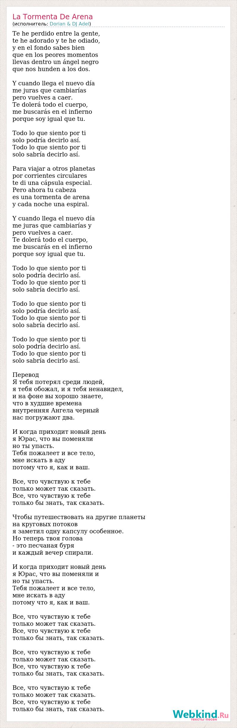 Te he perdido entre la gente, te he adorado y te he odiado, y en el fondo sabes bien que en los peores momentos llevas dentro un ángel negro que nos hunden a los dos. Y cuando llega el nuevo día me juras que cambiarías pero vuelves a caer. Te dolerá todo el cuerpo, me buscarás en el infierno porque soy igual que tu. Todo lo que siento por ti solo podría decirlo así. Todo lo que siento por ti solo sabría decirlo así. Para viajar a otros planetas por corrientes circulares te di una cápsula especial. Pero ahora tu cabeza es una tormenta de arena y cada noche una espiral. Y cuando llega el nuevo día me juras que cambiarías y pero vuelves a caer. Te dolerá todo el cuerpo, me buscarás en el infierno porque soy igual que tu. Todo lo que siento por ti solo podría decirlo así. Todo lo que siento por ti solo sabría decirlo así. Todo lo que siento por ti solo podría decirlo así. Todo lo que siento por ti solo sabría decirlo así. Todo lo que siento por ti solo podría decirlo así. Todo lo que siento por ti solo sabría decirlo así. Перевод Я тебя потерял среди людей, я тебя обожал, и я тебя ненавидел, и на фоне вы хорошо знаете, что в худшие времена внутренняя Ангела черный нас погружают два. И когда приходит новый день я Юрас, что вы поменяли но ты упасть. Тебя пожалеет и все тело, мне искать в аду потому что я, как и ваш. Все, что чувствую к тебе только может так сказать. Все, что чувствую к тебе только бы знать, так сказать. Чтобы путешествовать на другие планеты на круговых потоков я заметил одну капсулу особенное. Но теперь твоя голова - это песчаная буря и каждый вечер спирали. И когда приходит новый день я Юрас, что вы поменяли и но ты упасть. Тебя пожалеет и все тело, мне искать в аду потому что я, как и ваш. Все, что чувствую к тебе только может так сказать. Все, что чувствую к тебе только бы знать, так сказать. Все, что чувствую к тебе только может так сказать. Все, что чувствую к тебе только бы знать, так сказать. Все, что чувствую к тебе только может так сказать. Все, что чувствую к тебе только бы знать, так сказать.