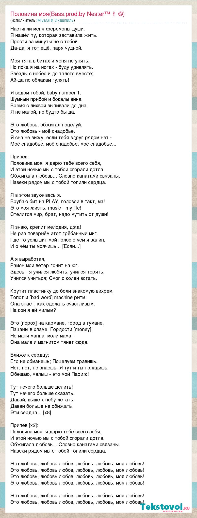 Настигли меня феромоны души. Я нашёл ту, которая заставила жить. Прости за минуты не с тобой. Да-да, я тот ещё, паря чудной. Моя тяга в битах и меня не унять, Но пока я на ногах - буду удивлять. Звёзды с небес и до талого вместе; Ай-да по облакам гулять! Я ведом тобой, baby number 1. Шумный прибой и бокалы вина. Время с лихвой выпивали до дна. Я не малой, но будто бы да. Это любовь, обжигал поцелуй. Это любовь - моё снадобье. Я сна не вижу, если тебя вдруг рядом нет - Моё снадобье, моё снадобье, моё снадобье... Припев: Половина моя, я дарю тебе всего себя, И этой ночью мы с тобой сгорали дотла. Обжигала любовь... Словно канатами связаны. Навеки рядом мы с тобой топили сердца. Я в этом звуке весь я. Врубаю бит на PLAY, головой в такт, ма! Это моя жизнь, music - my life! Стелится мир, брат, надо мутить от души! Я знаю, крепит мелодия, джа! Не раз повернём этот грёбанный миг. Где-то услышит мой голос о чём я залип, И о чём ты молчишь... [Если...] А я выработал, Район мой ветер гонит на юг. Здесь - я учился любить, учился терять, Учился учиться; Смог с колен встать. Крутит пластинку до боли знакомую вихрем, Топот и [bad word] machine ритм. Она знает, как сделать счастливым; На кой я ей милым? Это [порох] на кармане, город в тумане, Пацаны в хламе. Гордости [money]. Не мани манна, моли мама - Она мала и магнитом тянет сюда. Ближе к сердцу; Его не обманешь; Поцелуем травишь. Нет, нет, не знаешь. Я тут и ты поладишь. Обещаю, малыш - это мой Париж! Тут нечего больше делить! Тут нечего больше сказать. Давай, выше к небу летать. Давай больше не обижать Эти сердца... [x8] Припев [x2]: Половина моя, я дарю тебе всего себя, И этой ночью мы с тобой сгорали дотла. Обжигала любовь... Словно канатами связаны. Навеки рядом мы с тобой топили сердца. Это любовь, любовь любов, любовь, любовь, моя любовь! Это любовь, любовь любов, любовь, любовь, моя любовь! Это любовь, любовь любов, любовь, любовь, моя любовь! Это любовь, любовь любов, любовь, любовь, моя любовь! Это любовь, любовь любов, любовь, любовь, моя любовь! Это любовь, любовь любов, любовь, любовь, моя любовь!