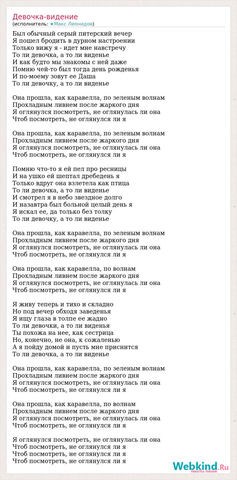 Был обычный серый питерский вечер Я пошел бродить в дурном настроении Только вижу я - идет мне навстречу То ли девочка, а то ли виденье И как будто мы знакомы с ней даже Помню чей-то был тогда день рожденья И по-моему зовут ее Даша То ли девочку, а то ли виденье Она прошла, как каравелла, по зеленым волнам Прохладным ливнем после жаркого дня Я оглянулся посмотреть, не оглянулась ли она Чтоб посмотреть, не оглянулся ли я Она прошла, как каравелла, по зеленым волнам Прохладным ливнем после жаркого дня Я оглянулся посмотреть, не оглянулась ли она Чтоб посмотреть, не оглянулся ли я Помню что-то я ей пел про ресницы И на ушко ей шептал дребедень я Только вдруг она взлетела как птица То ли девочка, а то ли виденье И смотрел я в небо звездное долго И назавтра был больной целый день я Я искал ее, да только без толку То ли девочку, а то ли виденье Она прошла, как каравелла, по зеленым волнам Прохладным ливнем после жаркого дня Я оглянулся посмотреть, не оглянулась ли она Чтоб посмотреть, не оглянулся ли я Она прошла, как каравелла, по волнам Прохладным ливнем после жаркого дня Я оглянулся посмотреть, не оглянулась ли она Чтоб посмотреть, не оглянулся ли я Я живу теперь и тихо и складно Но под вечер обходя заведенья Я ищу глаза в толпе ее жадно То ли девочки, а то ли виденья Ты похожа на нее, как сестрица Но, конечно, не она, к сожаленью А я пойду домой и пусть мне приснится То ли девочка, а то ли виденье Она прошла, как каравелла, по зеленым волнам Прохладным ливнем после жаркого дня Я оглянулся посмотреть, не оглянулась ли она Чтоб посмотреть, не оглянулся ли я Она прошла, как каравелла, по волнам Прохладным ливнем после жаркого дня Я оглянулся посмотреть, не оглянулась ли она Чтоб посмотреть, не оглянулся ли я Я оглянулся посмотреть, не оглянулась ли она Чтоб посмотреть, не оглянулся ли я Чтоб посмотреть, не оглянулся ли я Чтоб посмотреть, не оглянулся ли я