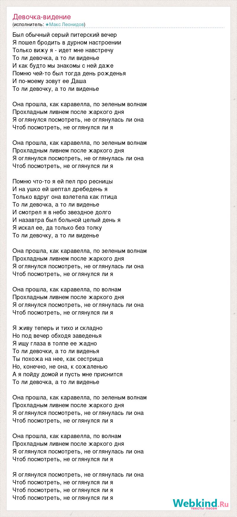 Был обычный серый питерский вечер Я пошел бродить в дурном настроении Только вижу я - идет мне навстречу То ли девочка, а то ли виденье И как будто мы знакомы с ней даже Помню чей-то был тогда день рожденья И по-моему зовут ее Даша То ли девочку, а то ли виденье Она прошла, как каравелла, по зеленым волнам Прохладным ливнем после жаркого дня Я оглянулся посмотреть, не оглянулась ли она Чтоб посмотреть, не оглянулся ли я Она прошла, как каравелла, по зеленым волнам Прохладным ливнем после жаркого дня Я оглянулся посмотреть, не оглянулась ли она Чтоб посмотреть, не оглянулся ли я Помню что-то я ей пел про ресницы И на ушко ей шептал дребедень я Только вдруг она взлетела как птица То ли девочка, а то ли виденье И смотрел я в небо звездное долго И назавтра был больной целый день я Я искал ее, да только без толку То ли девочку, а то ли виденье Она прошла, как каравелла, по зеленым волнам Прохладным ливнем после жаркого дня Я оглянулся посмотреть, не оглянулась ли она Чтоб посмотреть, не оглянулся ли я Она прошла, как каравелла, по волнам Прохладным ливнем после жаркого дня Я оглянулся посмотреть, не оглянулась ли она Чтоб посмотреть, не оглянулся ли я Я живу теперь и тихо и складно Но под вечер обходя заведенья Я ищу глаза в толпе ее жадно То ли девочки, а то ли виденья Ты похожа на нее, как сестрица Но, конечно, не она, к сожаленью А я пойду домой и пусть мне приснится То ли девочка, а то ли виденье Она прошла, как каравелла, по зеленым волнам Прохладным ливнем после жаркого дня Я оглянулся посмотреть, не оглянулась ли она Чтоб посмотреть, не оглянулся ли я Она прошла, как каравелла, по волнам Прохладным ливнем после жаркого дня Я оглянулся посмотреть, не оглянулась ли она Чтоб посмотреть, не оглянулся ли я Я оглянулся посмотреть, не оглянулась ли она Чтоб посмотреть, не оглянулся ли я Чтоб посмотреть, не оглянулся ли я Чтоб посмотреть, не оглянулся ли я