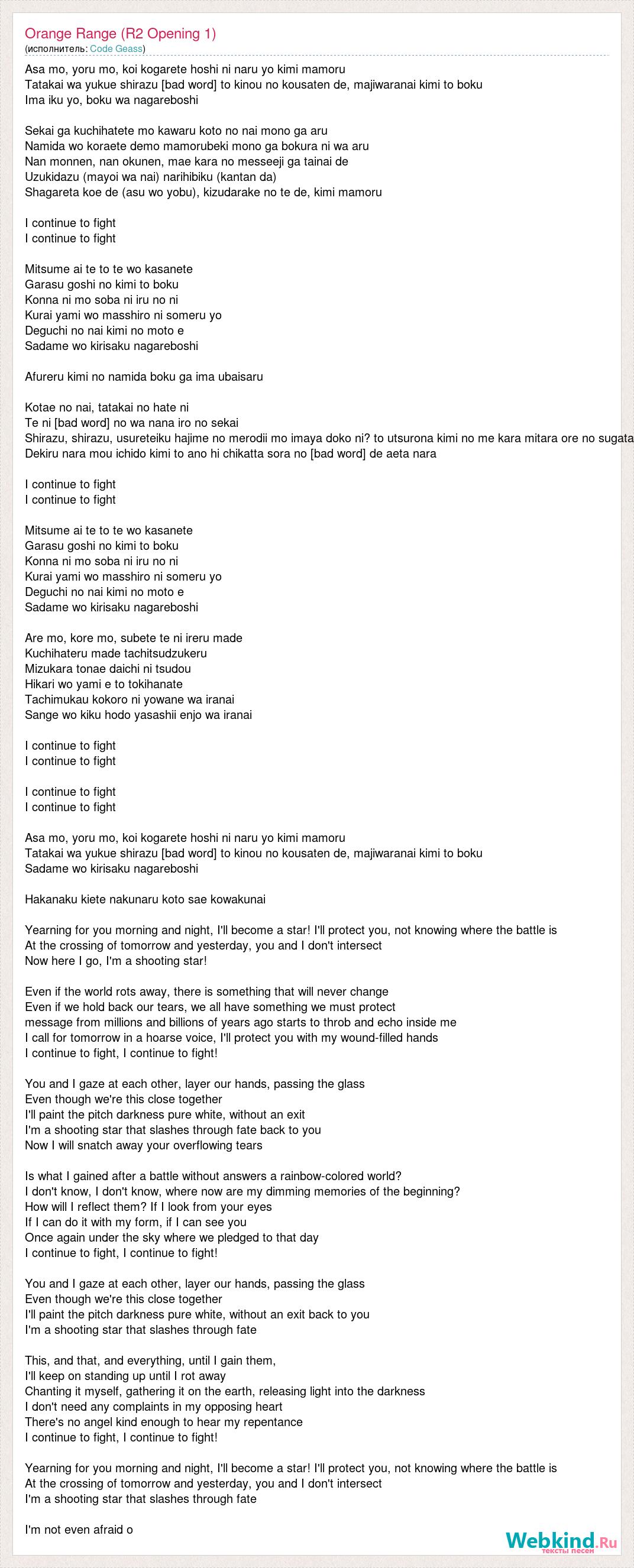 Asa mo, yoru mo, koi kogarete hoshi ni naru yo kimi mamoru Tatakai wa yukue shirazu [bad word] to kinou no kousaten de, majiwaranai kimi to boku Ima iku yo, boku wa nagareboshi Sekai ga kuchihatete mo kawaru koto no nai mono ga aru Namida wo koraete demo mamorubeki mono ga bokura ni wa aru Nan monnen, nan okunen, mae kara no messeeji ga tainai de Uzukidazu (mayoi wa nai) narihibiku (kantan da) Shagareta koe de (asu wo yobu), kizudarake no te de, kimi mamoru I continue to fight I continue to fight Mitsume ai te to te wo kasanete Garasu goshi no kimi to boku Konna ni mo soba ni iru no ni Kurai yami wo masshiro ni someru yo Deguchi no nai kimi no moto e Sadame wo kirisaku nagareboshi Afureru kimi no namida boku ga ima ubaisaru Kotae no nai, tatakai no hate ni Te ni [bad word] no wa nana iro no sekai Shirazu, shirazu, usureteiku hajime no merodii mo imaya doko ni? to utsurona kimi no me kara mitara ore no sugata Dekiru nara mou ichido kimi to ano hi chikatta sora no [bad word] de aeta nara I continue to fight I continue to fight Mitsume ai te to te wo kasanete Garasu goshi no kimi to boku Konna ni mo soba ni iru no ni Kurai yami wo masshiro ni someru yo Deguchi no nai kimi no moto e Sadame wo kirisaku nagareboshi Are mo, kore mo, subete te ni ireru made Kuchihateru made tachitsudzukeru Mizukara tonae daichi ni tsudou Hikari wo yami e to tokihanate Tachimukau kokoro ni yowane wa iranai Sange wo kiku hodo yasashii enjo wa iranai I continue to fight I continue to fight I continue to fight I continue to fight Asa mo, yoru mo, koi kogarete hoshi ni naru yo kimi mamoru Tatakai wa yukue shirazu [bad word] to kinou no kousaten de, majiwaranai kimi to boku Sadame wo kirisaku nagareboshi Hakanaku kiete nakunaru koto sae kowakunai Yearning for you morning and night, I'll become a star! I'll protect you, not knowing where the battle is At the crossing of tomorrow and yesterday, you and I don't intersect Now here I go, I'm a shooting star! Even if the world rots away, there is something that will never change Even if we hold back our tears, we all have something we must protect message from millions and billions of years ago starts to throb and echo inside me I call for tomorrow in a hoarse voice, I'll protect you with my wound-filled hands I continue to fight, I continue to fight! You and I gaze at each other, layer our hands, passing the glass Even though we're this close together I'll paint the pitch darkness pure white, without an exit I'm a shooting star that slashes through fate back to you Now I will snatch away your overflowing tears Is what I gained after a battle without answers a rainbow-colored world? I don't know, I don't know, where now are my dimming memories of the beginning? How will I reflect them? If I look from your eyes If I can do it with my form, if I can see you Once again under the sky where we pledged to that day I continue to fight, I continue to fight! You and I gaze at each other, layer our hands, passing the glass Even though we're this close together I'll paint the pitch darkness pure white, without an exit back to you I'm a shooting star that slashes through fate This, and that, and everything, until I gain them, I'll keep on standing up until I rot away Chanting it myself, gathering it on the earth, releasing light into the darkness I don't need any complaints in my opposing heart There's no angel kind enough to hear my repentance I continue to fight, I continue to fight! Yearning for you morning and night, I'll become a star! I'll protect you, not knowing where the battle is At the crossing of tomorrow and yesterday, you and I don't intersect I'm a shooting star that slashes through fate I'm not even afraid o