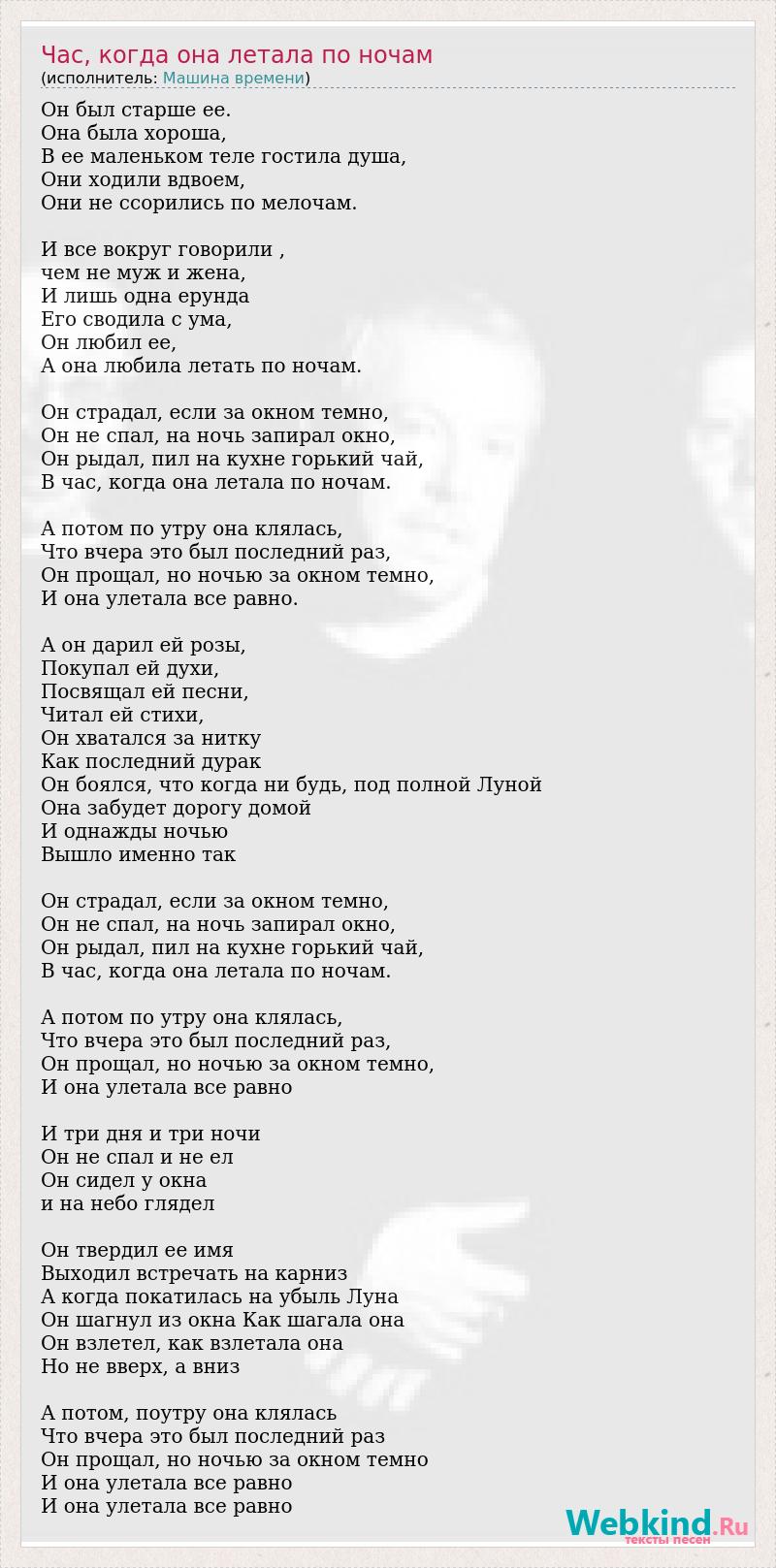 Он был старше ее. Она была хороша, В ее маленьком теле гостила душа, Они ходили вдвоем, Они не ссорились по мелочам. И все вокруг говорили , чем не муж и жена, И лишь одна ерунда Его сводила с ума, Он любил ее, А она любила летать по ночам. Он страдал, если за окном темно, Он не спал, на ночь запирал окно, Он рыдал, пил на кухне горький чай, В час, когда она летала по ночам. А потом по утру она клялась, Что вчера это был последний раз, Он прощал, но ночью за окном темно, И она улетала все равно. А он дарил ей розы, Покупал ей духи, Посвящал ей песни, Читал ей стихи, Он хватался за нитку Как последний дурак Он боялся, что когда ни будь, под полной Луной Она забудет дорогу домой И однажды ночью Вышло именно так Он страдал, если за окном темно, Он не спал, на ночь запирал окно, Он рыдал, пил на кухне горький чай, В час, когда она летала по ночам. А потом по утру она клялась, Что вчера это был последний раз, Он прощал, но ночью за окном темно, И она улетала все равно И три дня и три ночи Он не спал и не ел Он сидел у окна и на небо глядел Он твердил ее имя Выходил встречать на карниз А когда покатилась на убыль Луна Он шагнул из окна Как шагала она Он взлетел, как взлетала она Но не вверх, а вниз А потом, поутру она клялась Что вчера это был последний раз Он прощал, но ночью за окном темно И она улетала все равно И она улетала все равно
