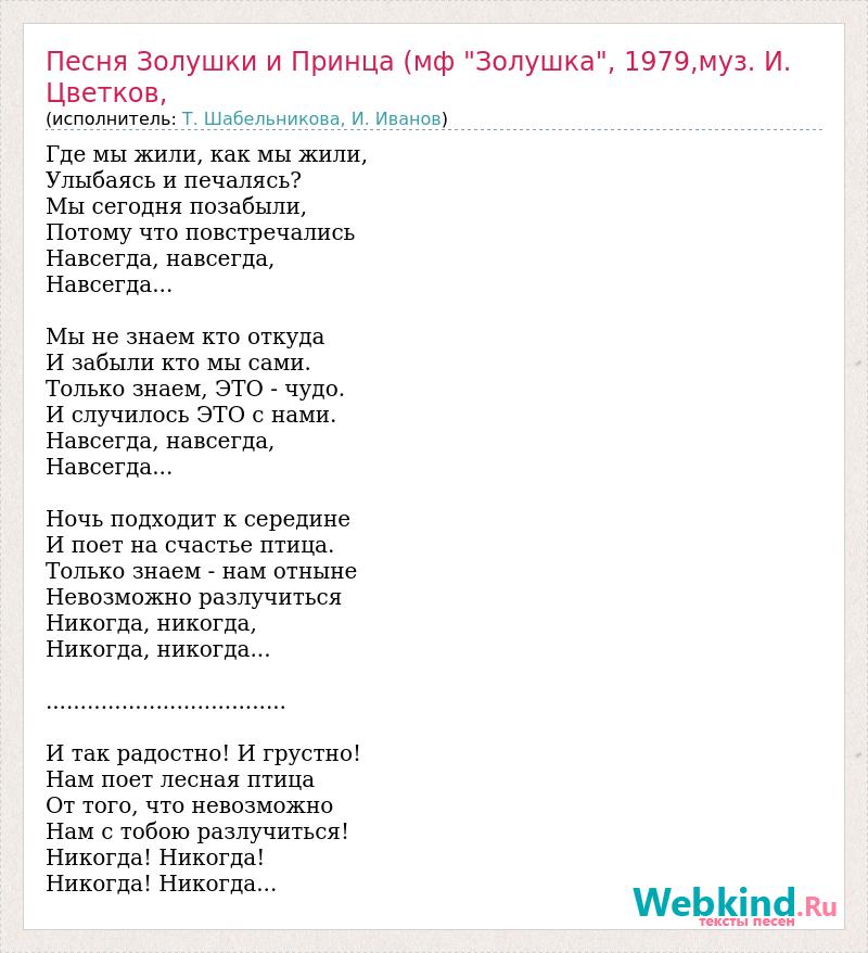 Где мы жили, как мы жили, Улыбаясь и печалясь? Мы сегодня позабыли, Потому что повстречались Навсегда, навсегда, Навсегда... Мы не знаем кто откуда И забыли кто мы сами. Только знаем, ЭТО - чудо. И случилось ЭТО с нами. Навсегда, навсегда, Навсегда... Ночь подходит к середине И поет на счастье птица. Только знаем - нам отныне Невозможно разлучиться Никогда, никогда, Никогда, никогда... ................................... И так радостно! И грустно! Нам поет лесная птица От того, что невозможно Нам с тобою разлучиться! Никогда! Никогда! Никогда! Никогда...