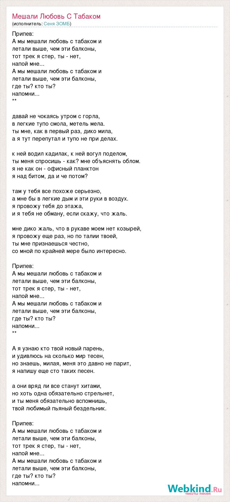 Припев: А мы мешали любовь с табаком и летали выше, чем эти балконы, тот трек я стер, ты - нет, напой мне... А мы мешали любовь с табаком и летали выше, чем эти балконы, где ты? кто ты? напомни... ** давай не чокаясь утром с горла, в легкие тупо смола, метель мела. ты мне, как в первый раз, дико мила, а я тут перепутал и тупо не при делах. к ней водил кадилак, к ней вогул поделом, ты меня спросишь - как? мне объяснять облом. я не как он - офисный планктон я над битом, да и че потом? там у тебя все похоже серьезно, а мне бы в легкие дым и эти руки в воздух. я провожу тебя до этажа, и я тебя не обману, если скажу, что жаль. мне дико жаль, что в рукаве моем нет козырей, я провожу еще раз, но по талии твоей, ты мне признаешься честно, со мной по крайней мере было интересно. Припев: А мы мешали любовь с табаком и летали выше, чем эти балконы, тот трек я стер, ты - нет, напой мне... А мы мешали любовь с табаком и летали выше, чем эти балконы, где ты? кто ты? напомни... ** А я узнаю кто твой новый парень, и удивлюсь на сколько мир тесен, но знаешь, милая, меня это давно не парит, я напишу еще сто таких песен. а они вряд ли все станут хитами, но хоть одна обязательно стрельнет, и ты меня обязательно вспомнишь, твой любимый пьяный бездельник. Припев: А мы мешали любовь с табаком и летали выше, чем эти балконы, тот трек я стер, ты - нет, напой мне... А мы мешали любовь с табаком и летали выше, чем эти балконы, где ты? кто ты? напомни...