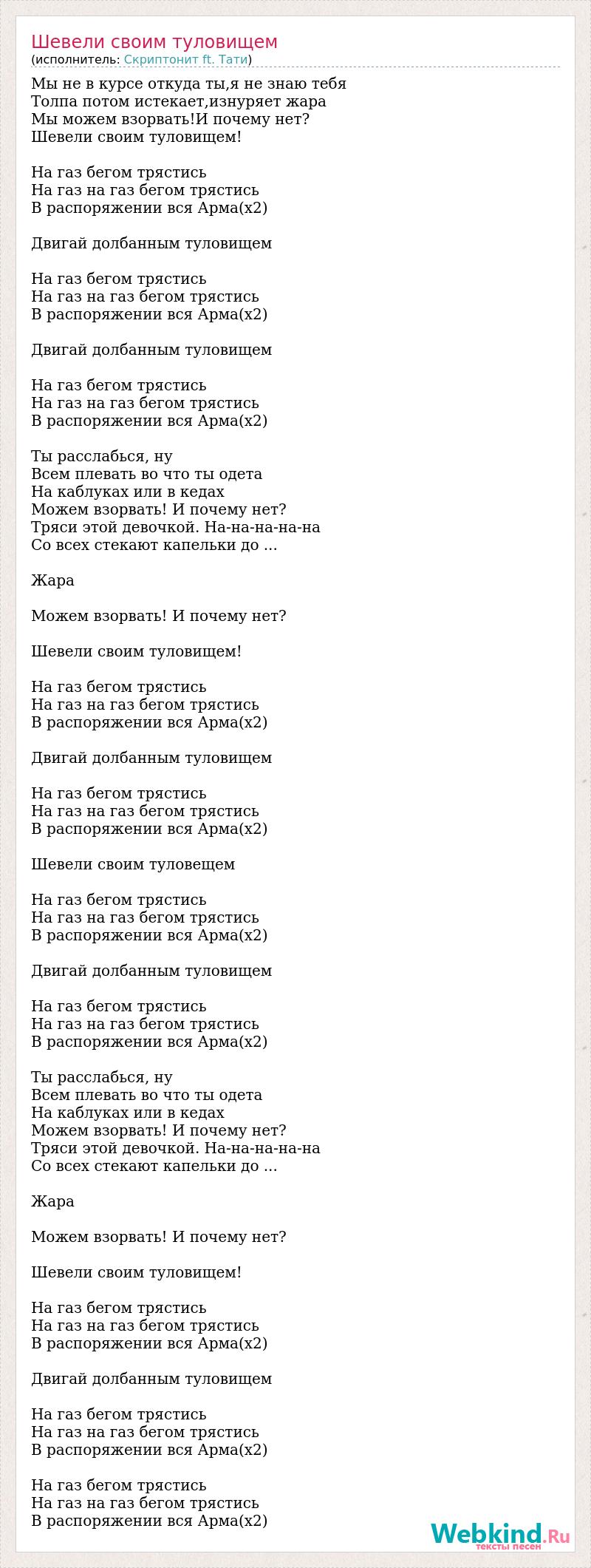 Мы не в курсе откуда ты,я не знаю тебя Толпа потом истекает,изнуряет жара Мы можем взорвать!И почему нет? Шевели своим туловищем! На газ бегом трястись На газ на газ бегом трястись В распоряжении вся Арма(x2) Двигай долбанным туловищем На газ бегом трястись На газ на газ бегом трястись В распоряжении вся Арма(x2) Двигай долбанным туловищем На газ бегом трястись На газ на газ бегом трястись В распоряжении вся Арма(x2) Ты расслабься, ну Всем плевать во что ты одета На каблуках или в кедах Можем взорвать! И почему нет? Тряси этой девочкой. На-на-на-на-на Со всех стекают капельки до ... Жара Можем взорвать! И почему нет? Шевели своим туловищем! На газ бегом трястись На газ на газ бегом трястись В распоряжении вся Арма(x2) Двигай долбанным туловищем На газ бегом трястись На газ на газ бегом трястись В распоряжении вся Арма(x2) Шевели своим туловещем На газ бегом трястись На газ на газ бегом трястись В распоряжении вся Арма(x2) Двигай долбанным туловищем На газ бегом трястись На газ на газ бегом трястись В распоряжении вся Арма(x2) Ты расслабься, ну Всем плевать во что ты одета На каблуках или в кедах Можем взорвать! И почему нет? Тряси этой девочкой. На-на-на-на-на Со всех стекают капельки до ... Жара Можем взорвать! И почему нет? Шевели своим туловищем! На газ бегом трястись На газ на газ бегом трястись В распоряжении вся Арма(x2) Двигай долбанным туловищем На газ бегом трястись На газ на газ бегом трястись В распоряжении вся Арма(x2) На газ бегом трястись На газ на газ бегом трястись В распоряжении вся Арма(x2)