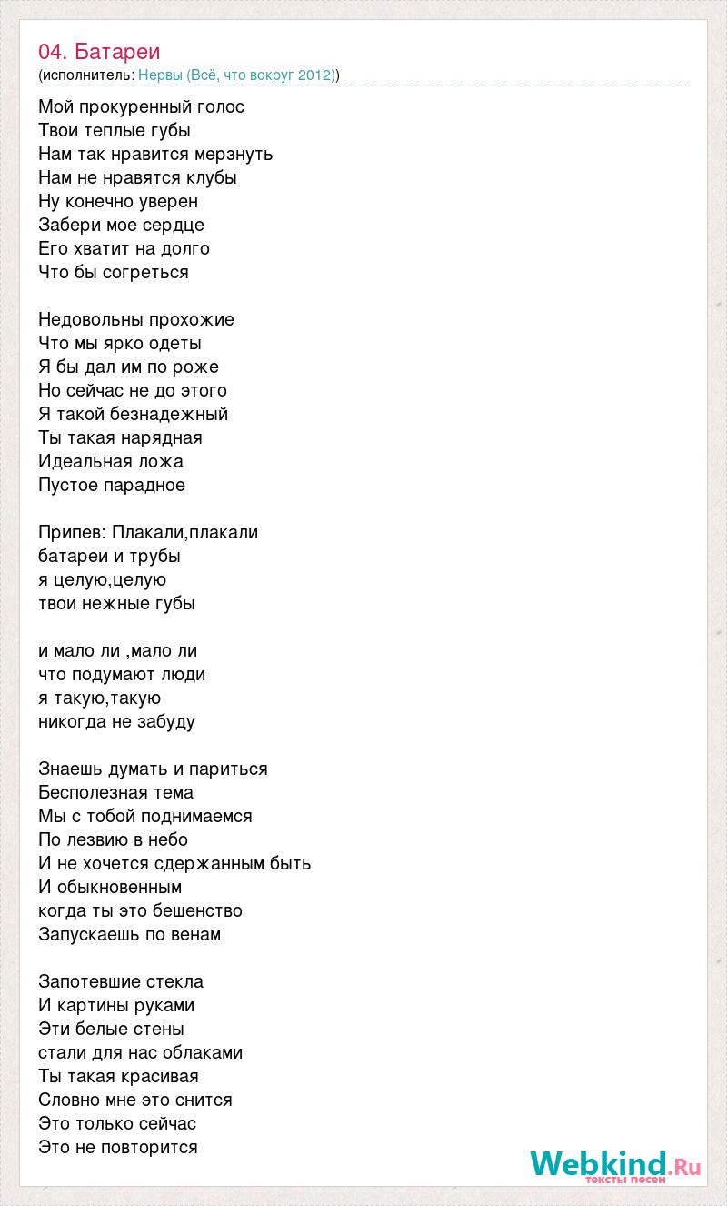 Мой прокуренный голос Твои теплые губы Нам так нравится мерзнуть Нам не нравятся клубы Ну конечно уверен Забери мое сердце Его хватит на долго Что бы согреться Недовольны прохожие Что мы ярко одеты Я бы дал им по роже Но сейчас не до этого Я такой безнадежный Ты такая нарядная Идеальная ложа Пустое парадное Припев: Плакали,плакали батареи и трубы я целую,целую твои нежные губы и мало ли ,мало ли что подумают люди я такую,такую никогда не забуду Знаешь думать и париться Бесполезная тема Мы с тобой поднимаемся По лезвию в небо И не хочется сдержанным быть И обыкновенным когда ты это бешенство Запускаешь по венам Запотевшие стекла И картины руками Эти белые стены стали для нас облаками Ты такая красивая Словно мне это снится Это только сейчас Это не повторится