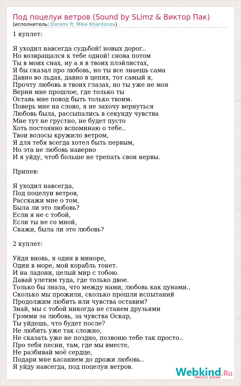 1 куплет: Я уходил навсегда судьбой! новых дорог.. Но возвращался к тебе одной! снова потом Ты в моих снах, ну а я в твоих плэйлистах, Я бы сказал про любовь, но ты все знаешь сама Давно во льдах, давно в цепях, тот самый я, Прочту любовь в твоих глазах, но ты уже не моя Верни мне прошлое, где только ты Оставь мне повод быть только твоим. Поверь мне на слово, я не захочу вернуться Любовь была, рассыпались в секунду чувства Мне тут не грустно, не будет пусто Хоть постоянно вспоминаю о тебе.. Твои волосы кружило ветром, Я для тебя всегда хотел быть первым, Но эта не любовь наверно И я уйду, чтоб больше не трепать свои нервы. Припев: Я уходил навсегда, Под поцелуи ветров, Расскажи мне о том, Была ли это любовь? Если я не с тобой, Если ты не со мной, Скажи, была ли это любовь? 2 куплет: Уйдя вновь, я один в миноре, Один в море, мой корабль тонет. И на ладони, целый мир с тобою. Давай улетим туда, где только двое. Только бы знала, что между нами, любовь как цунами.. Сколько мы прожили, сколько прошли испытаний Продолжим любить или чувства оставим? Знай, мы с тобой никогда не станем друзьями Грэмми за любовь, за чувства Оскар, Ты уйдешь, что будет после? Не любить уже так сложно, Не сказать уже не поздно, позвоню тебе так просто.. Про тебя песни, там, где мы вместе, Не разбивай моё сердце, Подари мне касанием до дрожи любовь.. Я уйду навсегда, под поцелуи ветров.