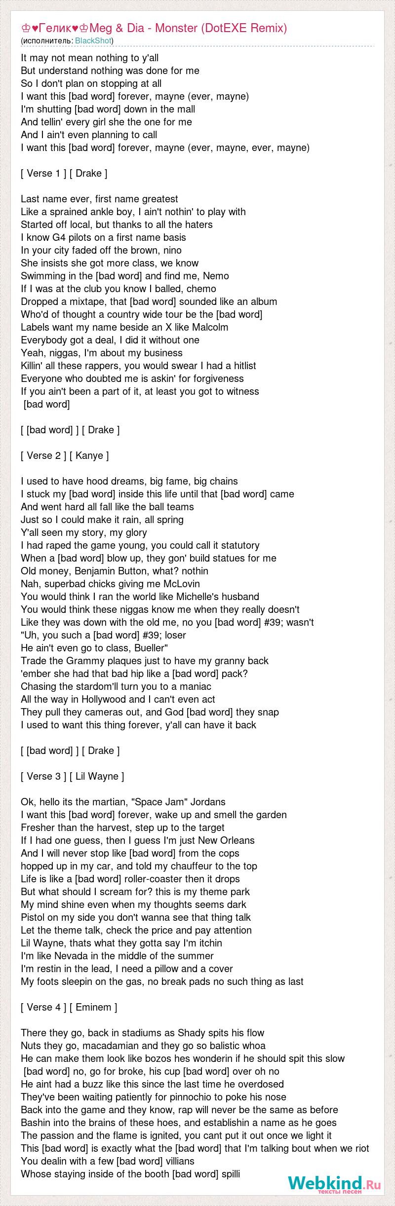 It may not mean nothing to y'all But understand nothing was done for me So I don't plan on stopping at all I want this [bad word] forever, mayne (ever, mayne) I'm shutting [bad word] down in the mall And tellin' every girl she the one for me And I ain't even planning to call I want this [bad word] forever, mayne (ever, mayne, ever, mayne) [ Verse 1 ] [ Drake ] Last name ever, first name greatest Like a sprained ankle boy, I ain't nothin' to play with Started off local, but thanks to all the haters I know G4 pilots on a first name basis In your city faded off the brown, nino She insists she got more class, we know Swimming in the [bad word] and find me, Nemo If I was at the club you know I balled, chemo Dropped a mixtape, that [bad word] sounded like an album Who'd of thought a country wide tour be the [bad word] Labels want my name beside an X like Malcolm Everybody got a deal, I did it without one Yeah, niggas, I'm about my business Killin' all these rappers, you would swear I had a hitlist Everyone who doubted me is askin' for forgiveness If you ain't been a part of it, at least you got to witness [bad word] [ [bad word] ] [ Drake ] [ Verse 2 ] [ Kanye ] I used to have hood dreams, big fame, big chains I stuck my [bad word] inside this life until that [bad word] came And went hard all fall like the ball teams Just so I could make it rain, all spring Y'all seen my story, my glory I had raped the game young, you could call it statutory When a [bad word] blow up, they gon' build statues for me Old money, Benjamin Button, what? nothin Nah, superbad chicks giving me McLovin You would think I ran the world like Michelle's husband You would think these niggas know me when they really doesn't Like they was down with the old me, no you [bad word] #39; wasn't "Uh, you such a [bad word] #39; loser He ain't even go to class, Bueller" Trade the Grammy plaques just to have my granny back 'ember she had that bad hip like a [bad word] pack? Chasing the stardom'll turn you to a maniac All the way in Hollywood and I can't even act They pull they cameras out, and God [bad word] they snap I used to want this thing forever, y'all can have it back [ [bad word] ] [ Drake ] [ Verse 3 ] [ Lil Wayne ] Ok, hello its the martian, "Space Jam" Jordans I want this [bad word] forever, wake up and smell the garden Fresher than the harvest, step up to the target If I had one guess, then I guess I'm just New Orleans And I will never stop like [bad word] from the cops hopped up in my car, and told my chauffeur to the top Life is like a [bad word] roller-coaster then it drops But what should I scream for? this is my theme park My mind shine even when my thoughts seems dark Pistol on my side you don't wanna see that thing talk Let the theme talk, check the price and pay attention Lil Wayne, thats what they gotta say I'm itchin I'm like Nevada in the middle of the summer I'm restin in the lead, I need a pillow and a cover My foots sleepin on the gas, no break pads no such thing as last [ Verse 4 ] [ Eminem ] There they go, back in stadiums as Shady spits his flow Nuts they go, macadamian and they go so balistic whoa He can make them look like bozos hes wonderin if he should spit this slow [bad word] no, go for broke, his cup [bad word] over oh no He aint had a buzz like this since the last time he overdosed They've been waiting patiently for pinnochio to poke his nose Back into the game and they know, rap will never be the same as before Bashin into the brains of these hoes, and establishin a name as he goes The passion and the flame is ignited, you cant put it out once we light it This [bad word] is exactly what the [bad word] that I'm talking bout when we riot You dealin with a few [bad word] villians Whose staying inside of the booth [bad word] spilli