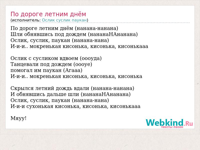 По дороге летним днём (нанана-нанана) Шли обнявшись под дождем (нананаНАнанана) Ослик, суслик, паукан (нанана-нана) И-и-и.. мокренькая кисонька, кисонька, кисонькааа Ослик с сусликом вдвоем (оооуда) Танцевали под дождем (оооуе) помогал им паукан (Агааа) И-и-и.. мокренькая кисонька, кисонька, кисонька Скрылся летний дождь вдали (нанана-нанана) И обнявшись дальше шли (нананаНАнанана) Ослик, суслик, паукан (нанана-нана) И-и-и сухонькая кисонька, кисонька, кисонькааа Мяуу!