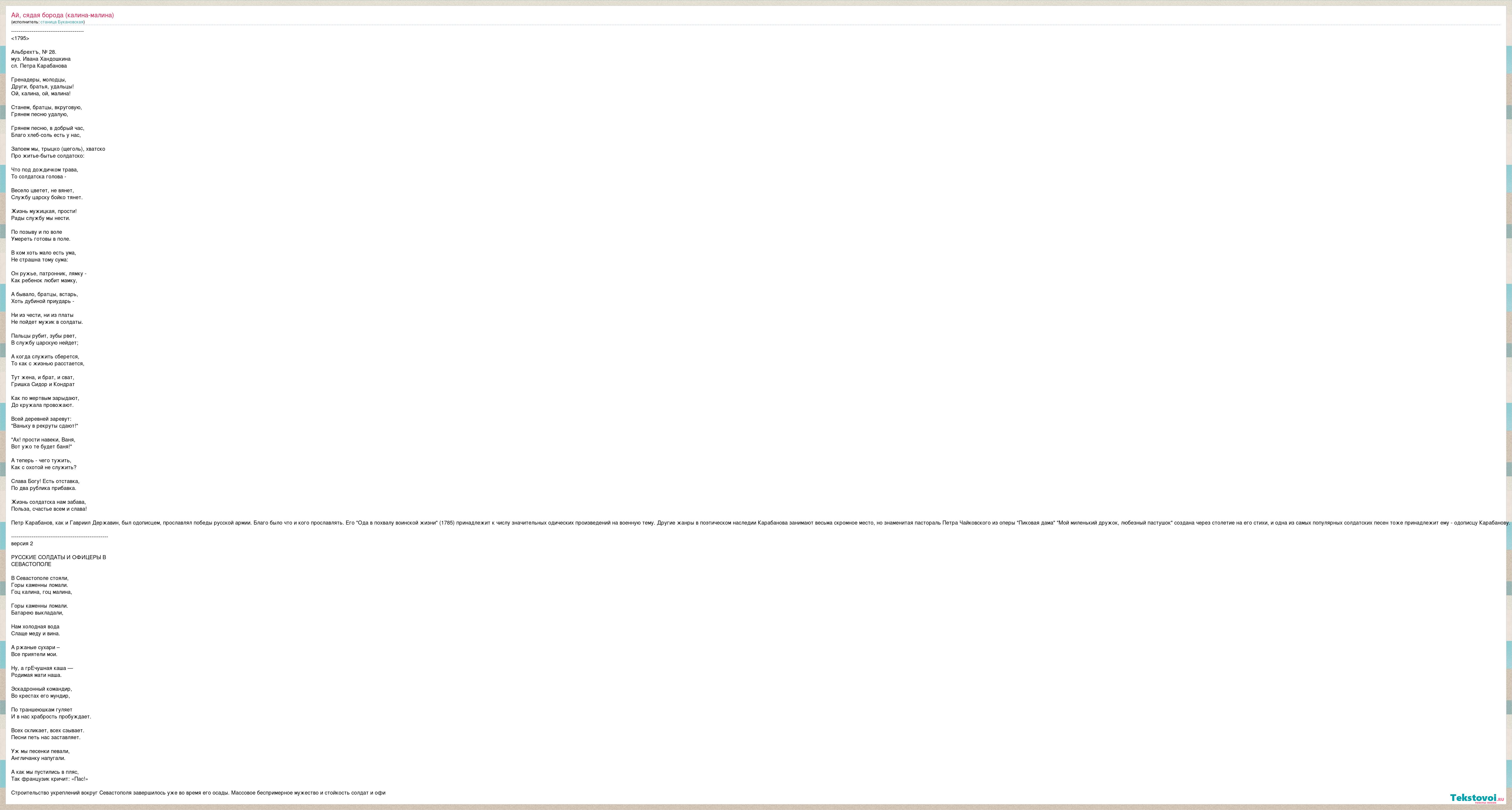 --------------------------------------- <1795> Альбрехтъ, № 28. муз. Ивана Хандошкина сл. Петра Карабанова Гренадеры, молодцы, Други, братья, удальцы! Ой, калина, ой, малина! Станем, братцы, вкруговую, Грянем песню удалую, Грянем песню, в добрый час, Благо хлеб-соль есть у нас, Запоем мы, трыцко (щеголь), хватско Про житье-бытье солдатско: Что под дождичком трава, То солдатска голова - Весело цветет, не вянет, Службу царску бойко тянет. Жизнь мужицкая, прости! Рады службу мы нести. По позыву и по воле Умереть готовы в поле. В ком хоть мало есть ума, Не страшна тому сума: Он ружье, патронник, лямку - Как ребенок любит мамку, А бывало, братцы, встарь, Хоть дубиной приударь - Ни из чести, ни из платы Не пойдет мужик в солдаты. Пальцы рубит, зубы рвет, В службу царскую нейдет; А когда служить сберется, То как с жизнью расстается, Тут жена, и брат, и сват, Гришка Сидор и Кондрат Как по мертвым зарыдают, До кружала провожают. Всей деревней заревут: "Ваньку в рекруты сдают!" "Ах! прости навеки, Ваня, Вот ужо те будет баня!" А теперь - чего тужить, Как с охотой не служить? Слава Богу! Есть отставка, По два рублика прибавка. Жизнь солдатска нам забава, Польза, счастье всем и слава! Петр Карабанов, как и Гавриил Державин, был одописцем, прославлял победы русской армии. Благо было что и кого прославлять. Его "Ода в похвалу воинской жизни" (1785) принадлежит к числу значительных одических произведений на военную тему. Другие жанры в поэтическом наследии Карабанова занимают весьма скромное место, но знаменитая пастораль Петра Чайковского из оперы "Пиковая дама" "Мой миленький дружок, любезный пастушок" создана через столетие на его стихи, и одна из самых популярных солдатских песен тоже принадлежит ему - одописцу Карабанову. ---------------------------------------------------- версия 2 РУССКИЕ СОЛДАТЫ И ОФИЦЕРЫ В СЕВАСТОПОЛЕ В Севастополе стояли, Горы каменны ломали. Гоц калина, гоц малина, Горы каменны ломали. Батарею выкладали, Нам холодная вода Слаще меду и вина. А ржаные сухари – Все приятели мои. Ну, а грЕчушная каша — Родимая мати наша. Эскадронный командир, Во крестах его мундир, По траншеюшкам гуляет И в нас храбрость пробуждает. Всех скликает, всех сзывает. Песни петь нас заставляет. Уж мы песенки певали, Англичанку напугали. А как мы пустились в пляс, Так французик кричит: «Пас!» Строительство укреплений вокруг Севастополя завершилось уже во время его осады. Массовое беспримерное мужество и стойкость солдат и офи