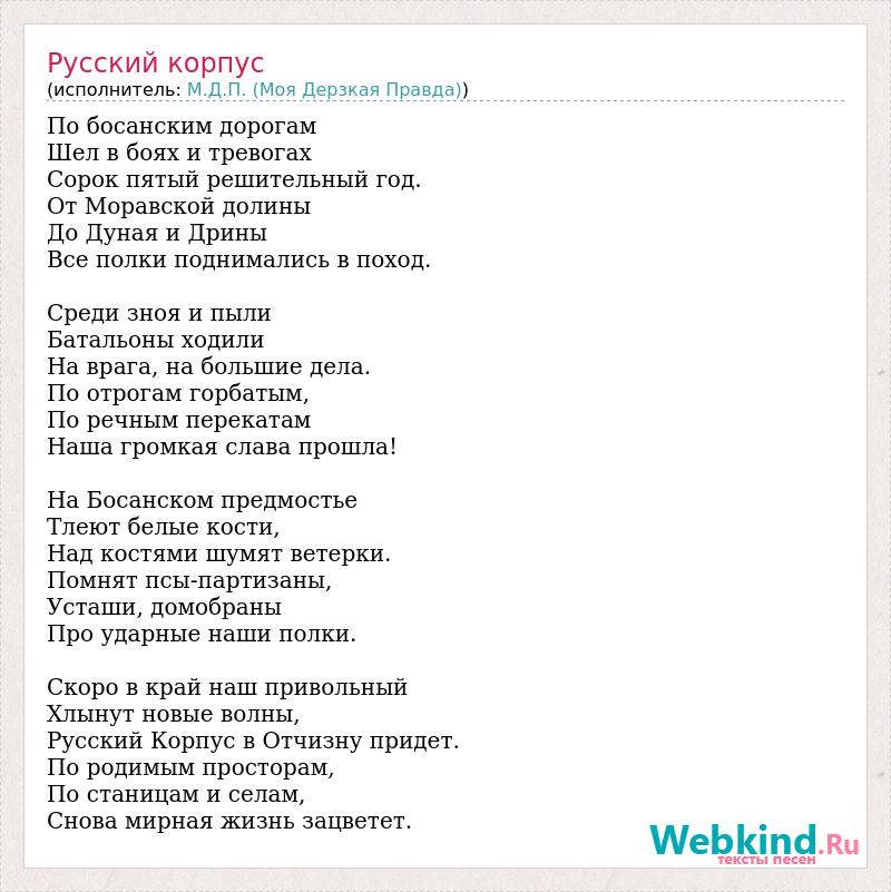 По босанским дорогам Шел в боях и тревогах Сорок пятый решительный год. От Моравской долины До Дуная и Дрины Все полки поднимались в поход. Среди зноя и пыли Батальоны ходили На врага, на большие дела. По отрогам горбатым, По речным перекатам Наша громкая слава прошла! На Босанском предмостье Тлеют белые кости, Над костями шумят ветерки. Помнят псы-партизаны, Усташи, домобраны Про ударные наши полки. Скоро в край наш привольный Хлынут новые волны, Русский Корпус в Отчизну придет. По родимым просторам, По станицам и селам, Снова мирная жизнь зацветет.