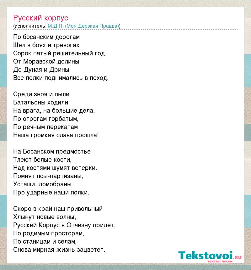 По босанским дорогам Шел в боях и тревогах Сорок пятый решительный год. От Моравской долины До Дуная и Дрины Все полки поднимались в поход. Среди зноя и пыли Батальоны ходили На врага, на большие дела. По отрогам горбатым, По речным перекатам Наша громкая слава прошла! На Босанском предмостье Тлеют белые кости, Над костями шумят ветерки. Помнят псы-партизаны, Усташи, домобраны Про ударные наши полки. Скоро в край наш привольный Хлынут новые волны, Русский Корпус в Отчизну придет. По родимым просторам, По станицам и селам, Снова мирная жизнь зацветет.