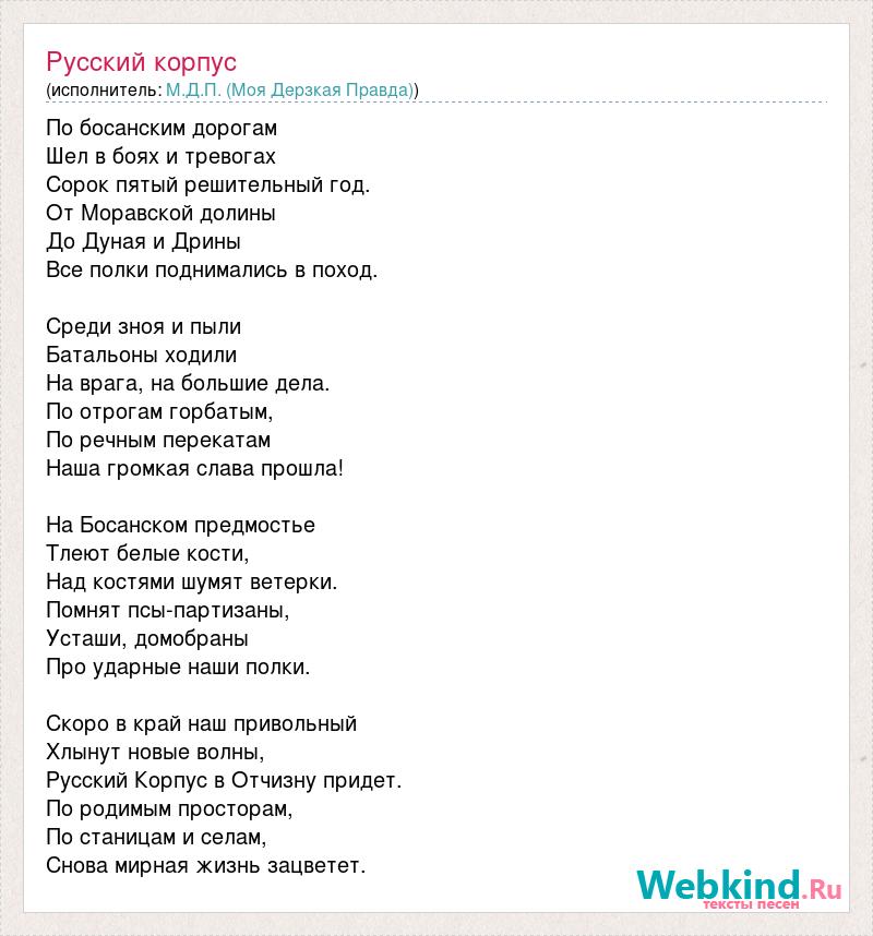 По босанским дорогам Шел в боях и тревогах Сорок пятый решительный год. От Моравской долины До Дуная и Дрины Все полки поднимались в поход. Среди зноя и пыли Батальоны ходили На врага, на большие дела. По отрогам горбатым, По речным перекатам Наша громкая слава прошла! На Босанском предмостье Тлеют белые кости, Над костями шумят ветерки. Помнят псы-партизаны, Усташи, домобраны Про ударные наши полки. Скоро в край наш привольный Хлынут новые волны, Русский Корпус в Отчизну придет. По родимым просторам, По станицам и селам, Снова мирная жизнь зацветет.