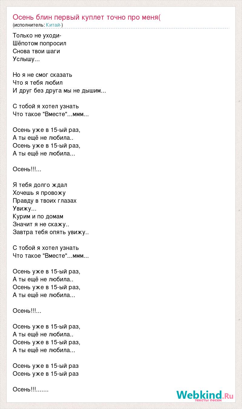Только не уходи- Шёпотом попросил Снова твои шаги Услышу... Но я не смог сказать Что я тебя любил И друг без друга мы не дышим... С тобой я хотел узнать Что такое "Вместе"...ммм... Осень уже в 15-ый раз, А ты ещё не любила.. Осень уже в 15-ый раз, А ты ещё не любила... Осень!!!... Я тебя долго ждал Хочешь я провожу Правду в твоих глазах Увижу... Курим и по домам Значит я не скажу.. Завтра тебя опять увижу.. С тобой я хотел узнать Что такое "Вместе"...ммм... Осень уже в 15-ый раз, А ты ещё не любила.. Осень уже в 15-ый раз, А ты ещё не любила... Осень!!!... Осень уже в 15-ый раз, А ты ещё не любила.. Осень уже в 15-ый раз, А ты ещё не любила... Осень уже в 15-ый раз Осень уже в 15-ый раз Осень!!!.......