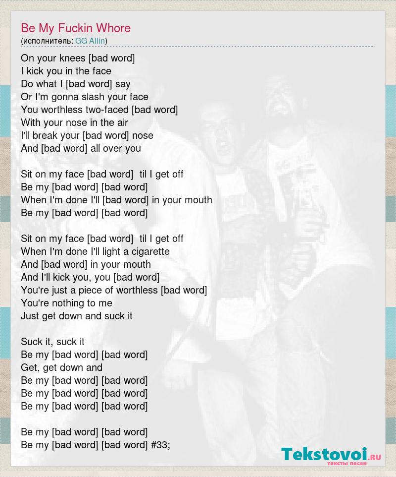 On your knees [bad word] I kick you in the face Do what I [bad word] say Or I'm gonna slash your face You worthless two-faced [bad word] With your nose in the air I'll break your [bad word] nose And [bad word] all over you Sit on my face [bad word] til I get off Be my [bad word] [bad word] When I'm done I'll [bad word] in your mouth Be my [bad word] [bad word] Sit on my face [bad word] til I get off When I'm done I'll light a cigarette And [bad word] in your mouth And I'll kick you, you [bad word] You're just a piece of worthless [bad word] You're nothing to me Just get down and suck it Suck it, suck it Be my [bad word] [bad word] Get, get down and Be my [bad word] [bad word] Be my [bad word] [bad word] Be my [bad word] [bad word] Be my [bad word] [bad word] Be my [bad word] [bad word] #33;