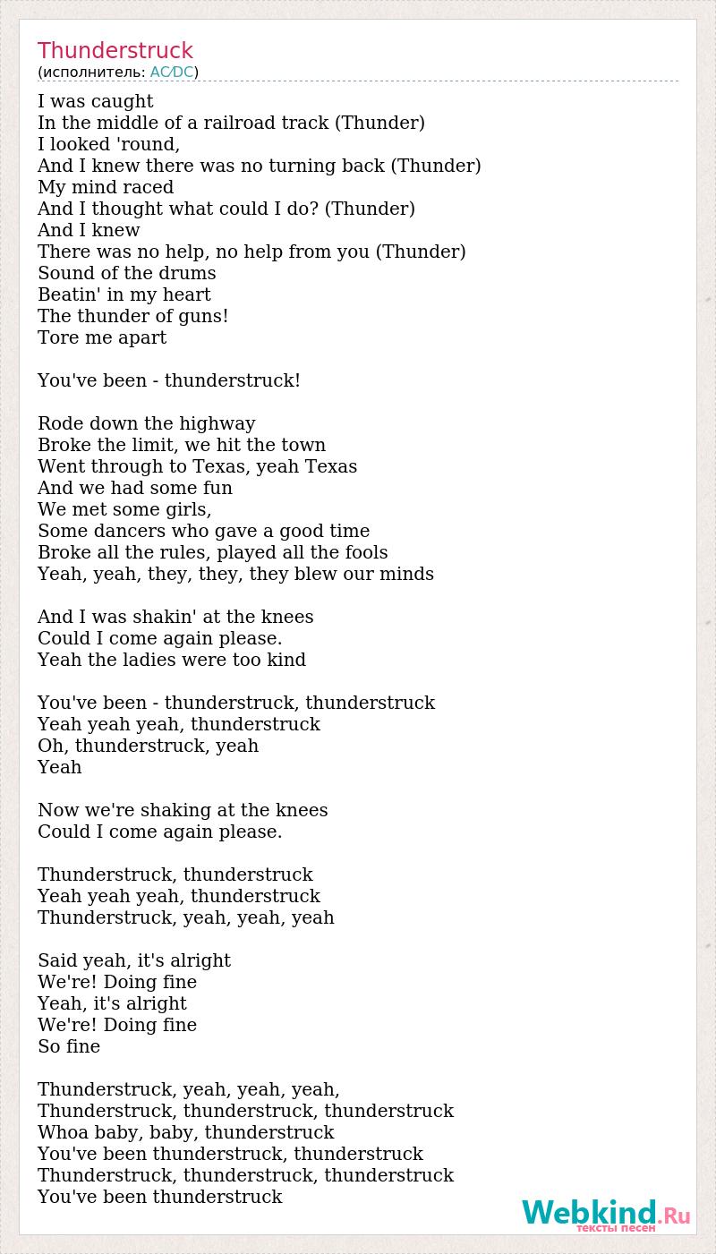 I was caught In the middle of a railroad track (Thunder) I looked 'round, And I knew there was no turning back (Thunder) My mind raced And I thought what could I do? (Thunder) And I knew There was no help, no help from you (Thunder) Sound of the drums Beatin' in my heart The thunder of guns! Tore me apart You've been - thunderstruck! Rode down the highway Broke the limit, we hit the town Went through to Texas, yeah Texas And we had some fun We met some girls, Some dancers who gave a good time Broke all the rules, played all the fools Yeah, yeah, they, they, they blew our minds And I was shakin' at the knees Could I come again please. Yeah the ladies were too kind You've been - thunderstruck, thunderstruck Yeah yeah yeah, thunderstruck Oh, thunderstruck, yeah Yeah Now we're shaking at the knees Could I come again please. Thunderstruck, thunderstruck Yeah yeah yeah, thunderstruck Thunderstruck, yeah, yeah, yeah Said yeah, it's alright We're! Doing fine Yeah, it's alright We're! Doing fine So fine Thunderstruck, yeah, yeah, yeah, Thunderstruck, thunderstruck, thunderstruck Whoa baby, baby, thunderstruck You've been thunderstruck, thunderstruck Thunderstruck, thunderstruck, thunderstruck You've been thunderstruck