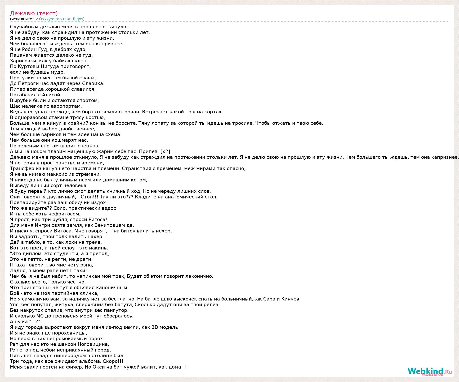 Случайным дежавю меня в прошлое откинуло, Я не забуду, как страждил на протяжении стольки лет. Я не делю свою на прошлую и эту жизни, Чем большего ты ждешь, тем она капризнее. Я не Робин Гуд, в дебрях худо, Пацанам живется далеко не гуд. Зарисовки, как у байках склеп, По Куртовы Нигуда приговорят, если не будешь мудр. Прогулки по местам былой славы, До Петроги нас ладят через Славика. Питер всегда хорошкой славился, Потабачил с Алисой. Вырубки были и остаются спортом, Щас налегке по аэропортам. Ведь в ее ушах прежде, чем борт от земли оторван, Встречает какой-то в на кортах. В одноразовом стакане трясу костью, Больше, чем я кинул в крайний кон вы не бросите. Тяну лопату за которой ты идешь на тросике, Чтобы отжать и твою себе. Тем каждый выбор двойственнее, Чем больше вариков и тем злее наша схема. Чем больше они кошмарят нас, По зеленым спотам шарит спецназ. А мы на ноком плавим маценькую жарим себе пас. Припев: [х2] Дежавю меня в прошлое откинуло, Я не забуду как страждил на протежении стольки лет. Я не делю свою на прошлую и эту жизни, Чем большего ты ждешь, тем она капризнее. Я потерян в пространстве и времени, Трансфер из канувшего царства и племени. Странствия с временем, меж мирами так опасно, Я не вынимаю макксис из стремени. Я никогда не был уличным псом или домашним котом, Выведу личный сорт человека. Я буду первый кто лично смог делать книжный ход, Но не череду лишних слов. Они говорят я двуличный, - Стоп!!! Так ли это??? Кладите на анатомический стол, Препарируйте раз ваш обидчик издох. Что же видите?? Соло, практически вздор И ты себе хоть нефритосом, Я прост, как три рубля, спроси Ригоса! Для меня Ингри свята земля, как Зенитовцам да, И пискля, спроси Витоса. Мне говорят, - "на биток валить нехер, Вы задроты, твой толк валить нахер. Дай в табло, а то, как лохи на треке, Вот это прет, а твой флоу - это накипь. "Это диплом, это студенты, а я препод, Это не гетто, не регги, не драги. Птаха говорит, во мне нету рэпа, Ладно, в моем рэпе нет Птахи!! Чем бы я не был набит, то напичкан мой трек, Будет об этом говорит лаконично. Сколько всего, только честно, Что принято нынче тут я объявил каноничным. Брё - это не моя партийная кличка, Но я самолично вам, за наличку нет за бесплатно, На батле шлю выскочек спать на больничный,как Сара и Кинчев. Упс, бес попутал, житуха, вверх-вниз без батута, Сколько дадут они за твой релиз, Без накруток спалив, что внутри вес пангутор. И сколько МС до греповеня моей тут обосралось, А ну ка "...?". Я иду города выростают вокруг меня из-под земли, как 3D модель И я не знаю, где пороховницы, Но верю в них непромокаемый порох. Рэп для нас это не шансон Ноговицина, Рэп это под небом неприкаянный город. Пять лет назад я нищебродом в столице был, Три года, как все ожидают альбома. Скоро!!! Меня звали гостем на фичер, Но Окси на бит чужой валит, как дома!!!