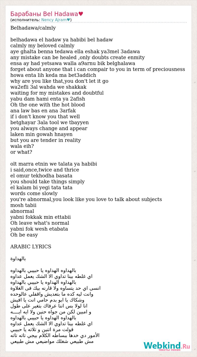 Belhadawa/calmly belhadawa el hadaw ya habibi bel hadaw calmly my beloved calmly aye ghalta benna tedawa ella eshak ya3mel 3adawa any mistake can be healed ,only doubts create enmity ensa ay had yetsawa walla a9arnu bik belghalawa forget about anyone that i can compair to you in term of preciousness howa enta lih keda ma bet3addich why are you like that,you don't let it go wa2efli 3al wahda we shakkak waiting for my mistakes and doubtful yabu dam hami enta ya 2afish Oh the one with the hot blood ana law bas en ana 3arfak if i don't know you that well betghayar 3ala tool we tbayyen you always change and appear laken min gowah hnayen but you are tender in reality wala eih? or what? olt marra etnin we talata ya habibi i said,once,twice and thrice el omur tekhodha basata you should take things simply el kalam bi yegi tata tata words come slowly you're abnormal,you look like you love to talk about subjects mosh tabii abnormal yabni fokkak min ettabii Oh leave what's normal yabni fok wesh etabata Oh be easy ARABIC LYRICS بالهداوة بالهداوه الهداوه يا حبيبي بالهداوه اي غلطه بينا تداوي الا الشك يعمل عداوه بالهداوه الهداوه يا حبيبي بالهداوه انسى اي حد يتساوه ولا قارنه بيك فى الغلاوة وانت ليه كده ما بتعديش واقفلي عالوحده وشكاك يا ابو بدم حامي انت يا افيش انا لولا بس اننا عرفاك بتغير على طول و امبين لكن من جواه حنين ولا ايه ايــــه بالهداوه الهداوه يا حبيبي بالهداوه اي غلطه بينا تداوي الا الشك يعمل عداوه قولت مرة اتنين و تلاته يا حبيبي الأمور دي خدها ببساطه الكلام بيجي تاته تاته مش طبيعي شغلك مواضيعي مش طبيعي
