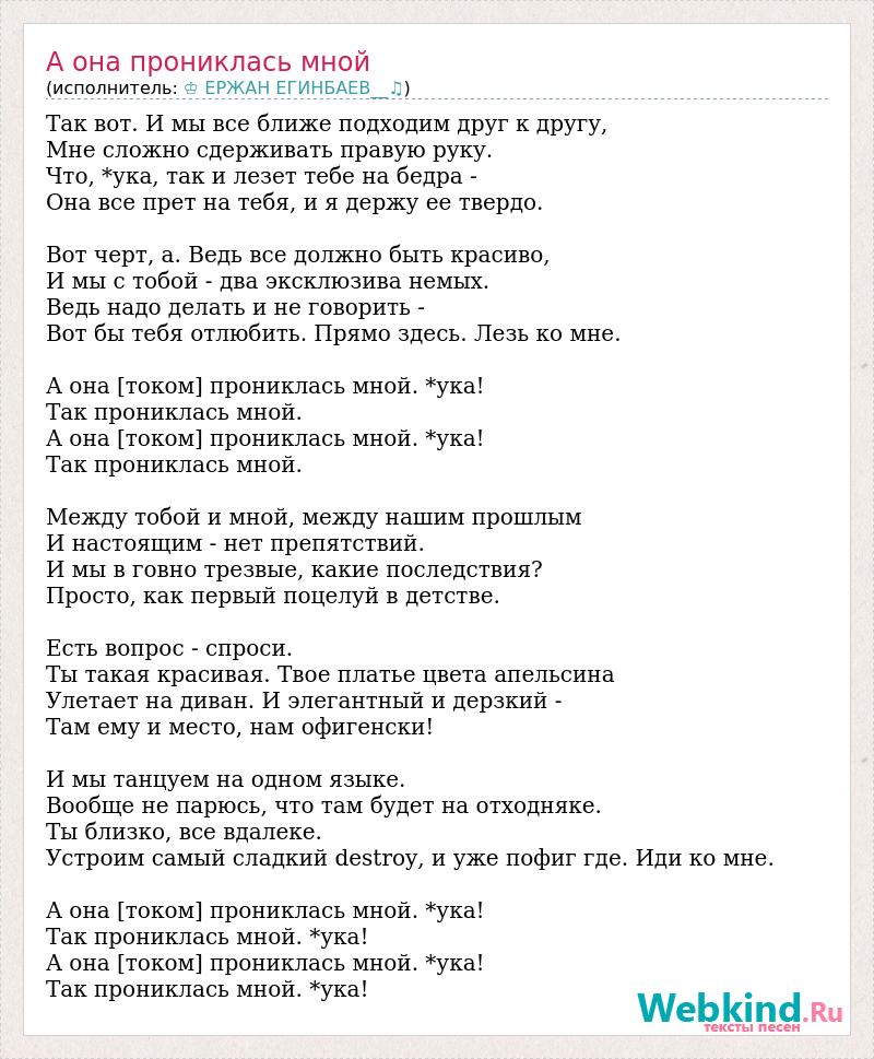 Так вот. И мы все ближе подходим друг к другу, Мне сложно сдерживать правую руку. Что, *ука, так и лезет тебе на бедра - Она все прет на тебя, и я держу ее твердо. Вот черт, а. Ведь все должно быть красиво, И мы с тобой - два эксклюзива немых. Ведь надо делать и не говорить - Вот бы тебя отлюбить. Прямо здесь. Лезь ко мне. А она [током] прониклась мной. *ука! Так прониклась мной. А она [током] прониклась мной. *ука! Так прониклась мной. Между тобой и мной, между нашим прошлым И настоящим - нет препятствий. И мы в говно трезвые, какие последствия? Просто, как первый поцелуй в детстве. Есть вопрос - спроси. Ты такая красивая. Твое платье цвета апельсина Улетает на диван. И элегантный и дерзкий - Там ему и место, нам офигенски! И мы танцуем на одном языке. Вообще не парюсь, что там будет на отходняке. Ты близко, все вдалеке. Устроим самый сладкий destroy, и уже пофиг где. Иди ко мне. А она [током] прониклась мной. *ука! Так прониклась мной. *ука! А она [током] прониклась мной. *ука! Так прониклась мной. *ука!