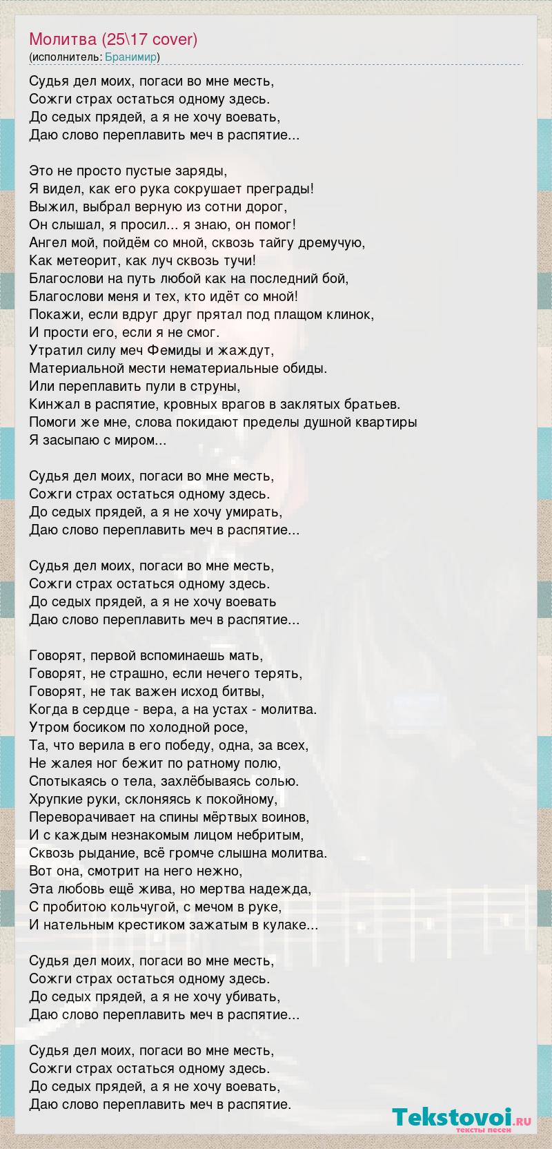 Судья дел моих, погаси во мне месть, Сожги страх остаться одному здесь. До седых прядей, а я не хочу воевать, Даю слово переплавить меч в распятие... Это не просто пустые заряды, Я видел, как его рука сокрушает преграды! Выжил, выбрал верную из сотни дорог, Он слышал, я просил... я знаю, он помог! Ангел мой, пойдём со мной, сквозь тайгу дремучую, Как метеорит, как луч сквозь тучи! Благослови на путь любой как на последний бой, Благослови меня и тех, кто идёт со мной! Покажи, если вдруг друг прятал под плащом клинок, И прости его, если я не смог. Утратил силу меч Фемиды и жаждут, Материальной мести нематериальные обиды. Или переплавить пули в струны, Кинжал в распятие, кровных врагов в заклятых братьев. Помоги же мне, слова покидают пределы душной квартиры Я засыпаю с миром... Судья дел моих, погаси во мне месть, Сожги страх остаться одному здесь. До седых прядей, а я не хочу умирать, Даю слово переплавить меч в распятие... Судья дел моих, погаси во мне месть, Сожги страх остаться одному здесь. До седых прядей, а я не хочу воевать Даю слово переплавить меч в распятие... Говорят, первой вспоминаешь мать, Говорят, не страшно, если нечего терять, Говорят, не так важен исход битвы, Когда в сердце - вера, а на устах - молитва. Утром босиком по холодной росе, Та, что верила в его победу, одна, за всех, Не жалея ног бежит по ратному полю, Спотыкаясь о тела, захлёбываясь солью. Хрупкие руки, склоняясь к покойному, Переворачивает на спины мёртвых воинов, И с каждым незнакомым лицом небритым, Сквозь рыдание, всё громче слышна молитва. Вот она, смотрит на него нежно, Эта любовь ещё жива, но мертва надежда, С пробитою кольчугой, с мечом в руке, И нательным крестиком зажатым в кулаке... Судья дел моих, погаси во мне месть, Сожги страх остаться одному здесь. До седых прядей, а я не хочу убивать, Даю слово переплавить меч в распятие... Судья дел моих, погаси во мне месть, Сожги страх остаться одному здесь. До седых прядей, а я не хочу воевать, Даю слово переплавить меч в распятие.