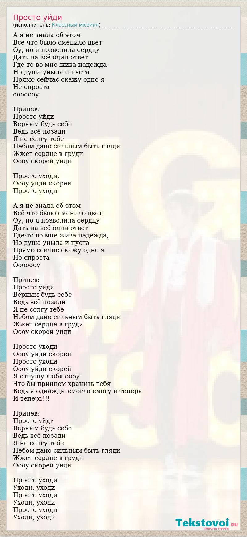 А я не знала об этом Всё что было сменило цвет Оу, но я позволила сердцу Дать на всё один ответ Где-то во мне жива надежда Но душа уныла и пуста Прямо сейчас скажу одно я Не спроста ооооооу Припев: Просто уйди Верным будь себе Ведь всё позади Я не солгу тебе Небом дано сильным быть гляди Жжет сердце в груди Оооу скорей уйди Просто уходи, Оооу уйди скорей Просто уходи А я не знала об этом Всё что было сменило цвет, Оу, но я позволила сердцу Дать на всё один ответ Где-то во мне жива надежда, Но душа уныла и пуста Прямо сейчас скажу одно я Не спроста Ооооооу Припев: Просто уйди Верным будь себе Ведь всё позади Я не солгу тебе Небом дано сильным быть гляди Жжет сердце в груди Оооу скорей уйди Просто уходи Оооу уйди скорей Просто уходи Оооу уйди скорей Я отпущу любя оооу Что бы принцем хранить тебя Ведь я однажды смогла смогу и теперь И теперь!!! Припев: Просто уйди Верным будь себе Ведь всё позади Я не солгу тебе Небом дано сильным быть гляди Жжет сердце в груди Оооу скорей уйди Просто уходи Уходи, уходи Просто уходи Уходи, уходи Просто уходи Уходи, уходи