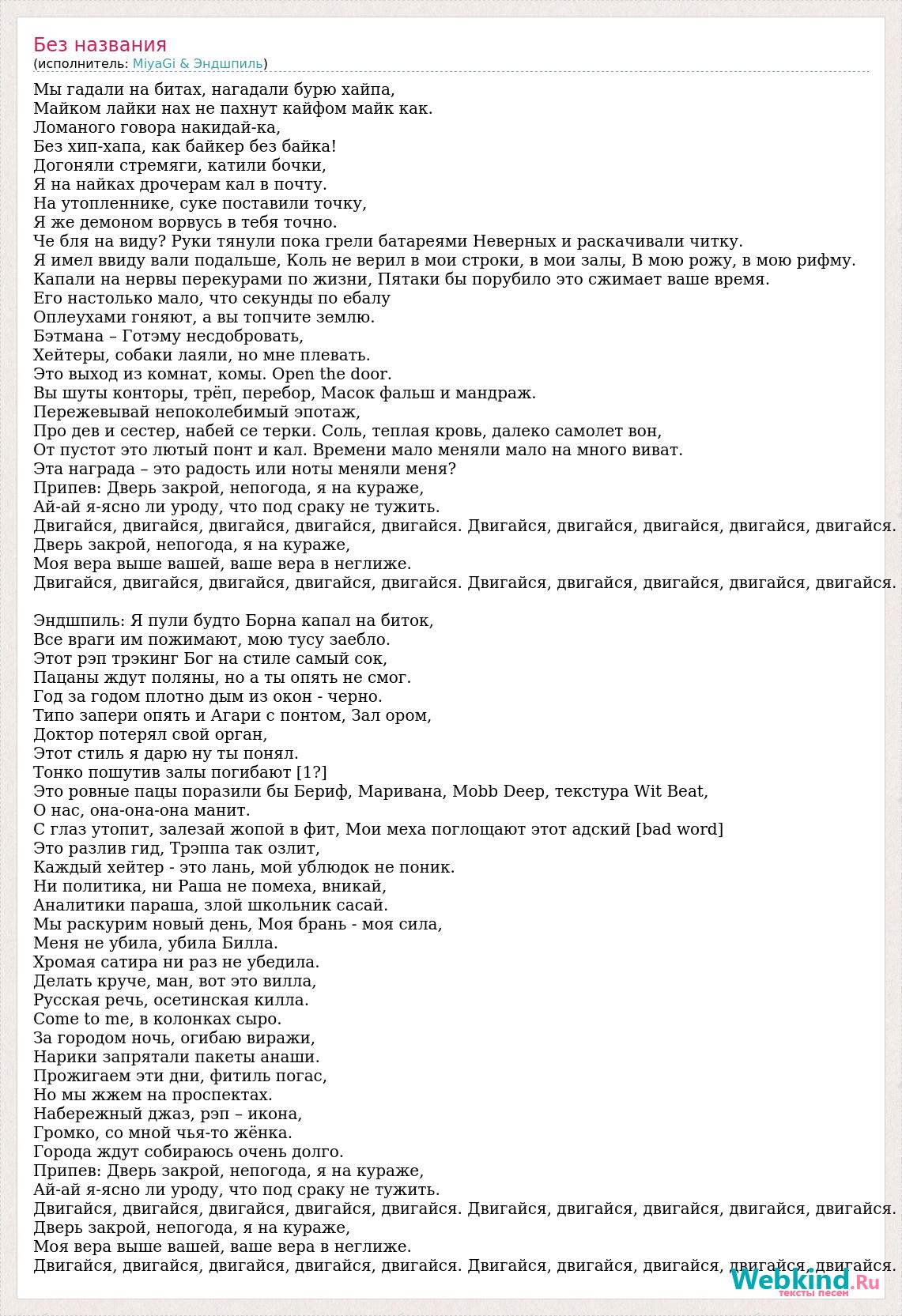 Мы гадали на битах, нагадали бурю хайпа, Майком лайки нах не пахнут кайфом майк как. Ломаного говора накидай-ка, Без хип-хапа, как байкер без байка! Догоняли стремяги, катили бочки, Я на найках дрочерам кал в почту. На утопленнике, суке поставили точку, Я же демоном ворвусь в тебя точно. Че бля на виду? Руки тянули пока грели батареями Неверных и раскачивали читку. Я имел ввиду вали подальше, Коль не верил в мои строки, в мои залы, В мою рожу, в мою рифму. Капали на нервы перекурами по жизни, Пятаки бы порубило это сжимает ваше время. Его настолько мало, что секунды по ебалу Оплеухами гоняют, а вы топчите землю. Бэтмана – Готэму несдобровать, Хейтеры, собаки лаяли, но мне плевать. Это выход из комнат, комы. Open the door. Вы шуты конторы, трёп, перебор, Масок фальш и мандраж. Пережевывай непоколебимый эпотаж, Про дев и сестер, набей се терки. Соль, теплая кровь, далеко самолет вон, От пустот это лютый понт и кал. Времени мало меняли мало на много виват. Эта награда – это радость или ноты меняли меня? Припев: Дверь закрой, непогода, я на кураже, Ай-ай я-ясно ли уроду, что под сраку не тужить. Двигайся, двигайся, двигайся, двигайся, двигайся. Двигайся, двигайся, двигайся, двигайся, двигайся. Дверь закрой, непогода, я на кураже, Моя вера выше вашей, ваше вера в неглиже. Двигайся, двигайся, двигайся, двигайся, двигайся. Двигайся, двигайся, двигайся, двигайся, двигайся. Эндшпиль: Я пули будто Борна капал на биток, Все враги им пожимают, мою тусу заебло. Этот рэп трэкинг Бог на стиле самый сок, Пацаны ждут поляны, но а ты опять не смог. Год за годом плотно дым из окон - черно. Типо запери опять и Агари с понтом, Зал ором, Доктор потерял свой орган, Этот стиль я дарю ну ты понял. Тонко пошутив залы погибают [1?] Это ровные пацы поразили бы Бериф, Маривана, Mobb Deep, текстура Wit Beat, О нас, она-она-она манит. С глаз утопит, залезай жопой в фит, Мои меха поглощают этот адский [bad word] Это разлив гид, Трэппа так озлит, Каждый хейтер - это лань, мой ублюдок не поник. Ни политика, ни Раша не помеха, вникай, Аналитики параша, злой школьник сасай. Мы раскурим новый день, Моя брань - моя сила, Меня не убила, убила Билла. Хромая сатира ни раз не убедила. Делать круче, ман, вот это вилла, Русская речь, осетинская килла. Come to me, в колонках сыро. За городом ночь, огибаю виражи, Нарики запрятали пакеты анаши. Прожигаем эти дни, фитиль погас, Но мы жжем на проспектах. Набережный джаз, рэп – икона, Громко, со мной чья-то жёнка. Города ждут собираюсь очень долго. Припев: Дверь закрой, непогода, я на кураже, Ай-ай я-ясно ли уроду, что под сраку не тужить. Двигайся, двигайся, двигайся, двигайся, двигайся. Двигайся, двигайся, двигайся, двигайся, двигайся. Дверь закрой, непогода, я на кураже, Моя вера выше вашей, ваше вера в неглиже. Двигайся, двигайся, двигайся, двигайся, двигайся. Двигайся, двигайся, двигайся, двигайся, двигайся.