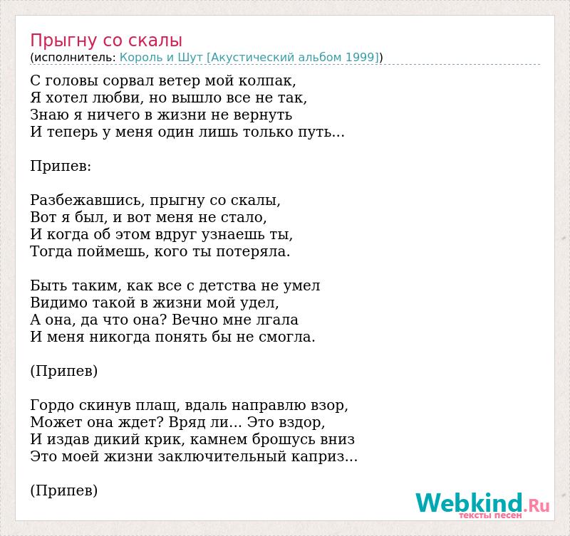 С головы сорвал ветер мой колпак, Я хотел любви, но вышло все не так, Знаю я ничего в жизни не вернуть И теперь у меня один лишь только путь... Припев: Разбежавшись, прыгну со скалы, Вот я был, и вот меня не стало, И когда об этом вдруг узнаешь ты, Тогда поймешь, кого ты потеряла. Быть таким, как все с детства не умел Видимо такой в жизни мой удел, А она, да что она? Вечно мне лгала И меня никогда понять бы не смогла. (Припев) Гордо скинув плащ, вдаль направлю взор, Может она ждет? Вряд ли... Это вздор, И издав дикий крик, камнем брошусь вниз Это моей жизни заключительный каприз... (Припев)