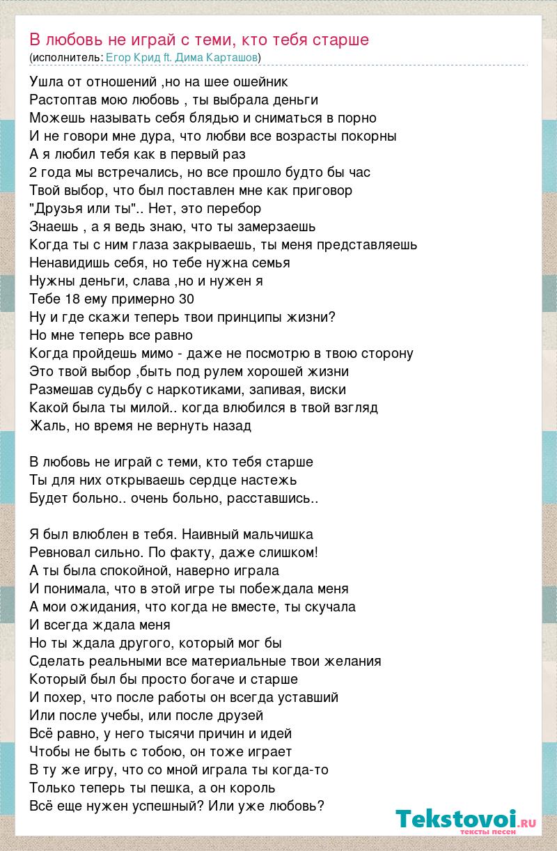 Ушла от отношений ,но на шее ошейник Растоптав мою любовь , ты выбрала деньги Можешь называть себя блядью и сниматься в порно И не говори мне дура, что любви все возрасты покорны А я любил тебя как в первый раз 2 года мы встречались, но все прошло будто бы час Твой выбор, что был поставлен мне как приговор "Друзья или ты".. Нет, это перебор Знаешь , а я ведь знаю, что ты замерзаешь Когда ты с ним глаза закрываешь, ты меня представляешь Ненавидишь себя, но тебе нужна семья Нужны деньги, слава ,но и нужен я Тебе 18 ему примерно 30 Ну и где скажи теперь твои принципы жизни? Но мне теперь все равно Когда пройдешь мимо - даже не посмотрю в твою сторону Это твой выбор ,быть под рулем хорошей жизни Размешав судьбу с наркотиками, запивая, виски Какой была ты милой.. когда влюбился в твой взгляд Жаль, но время не вернуть назад В любовь не играй с теми, кто тебя старше Ты для них открываешь сердце настежь Будет больно.. очень больно, расставшись.. Я был влюблен в тебя. Наивный мальчишка Ревновал сильно. По факту, даже слишком! А ты была спокойной, наверно играла И понимала, что в этой игре ты побеждала меня А мои ожидания, что когда не вместе, ты скучала И всегда ждала меня Но ты ждала другого, который мог бы Сделать реальными все материальные твои желания Который был бы просто богаче и старше И похер, что после работы он всегда уставший Или после учебы, или после друзей Всё равно, у него тысячи причин и идей Чтобы не быть с тобою, он тоже играет В ту же игру, что со мной играла ты когда-то Только теперь ты пешка, а он король Всё еще нужен успешный? Или уже любовь?