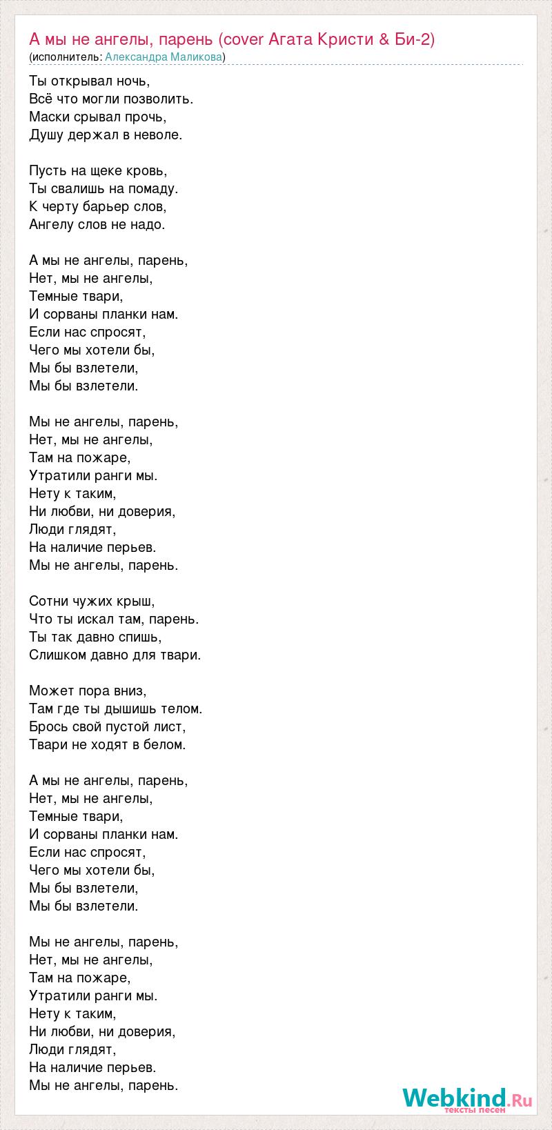 Ты открывал ночь, Всё что могли позволить. Маски срывал прочь, Душу держал в неволе. Пусть на щеке кровь, Ты свалишь на помаду. К черту барьер слов, Ангелу слов не надо. А мы не ангелы, парень, Нет, мы не ангелы, Темные твари, И сорваны планки нам. Если нас спросят, Чего мы хотели бы, Мы бы взлетели, Мы бы взлетели. Мы не ангелы, парень, Нет, мы не ангелы, Там на пожаре, Утратили ранги мы. Нету к таким, Ни любви, ни доверия, Люди глядят, На наличие перьев. Мы не ангелы, парень. Сотни чужих крыш, Что ты искал там, парень. Ты так давно спишь, Слишком давно для твари. Может пора вниз, Там где ты дышишь телом. Брось свой пустой лист, Твари не ходят в белом. А мы не ангелы, парень, Нет, мы не ангелы, Темные твари, И сорваны планки нам. Если нас спросят, Чего мы хотели бы, Мы бы взлетели, Мы бы взлетели. Мы не ангелы, парень, Нет, мы не ангелы, Там на пожаре, Утратили ранги мы. Нету к таким, Ни любви, ни доверия, Люди глядят, На наличие перьев. Мы не ангелы, парень.